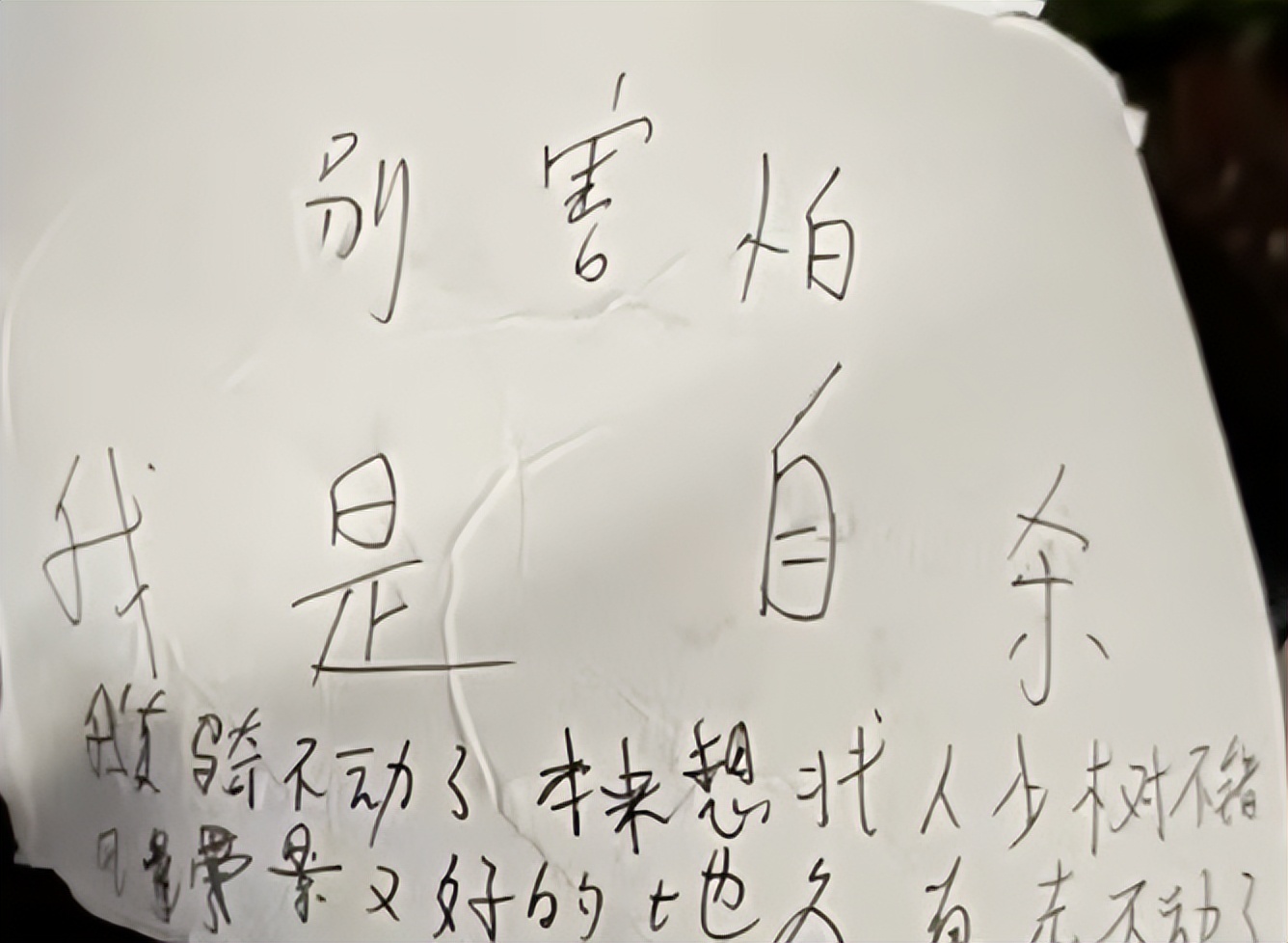 “别害怕,我是自杀。我真骑不动了,本来想找人少、树不错、风景又好的地方,真走不动了。”