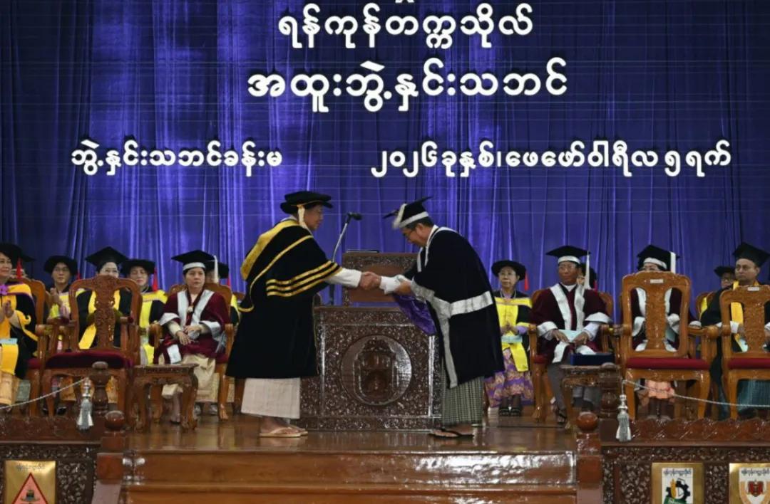 随后,出席仪式的国外大学校长及相关负责人分别发表了致辞。之后,仰光大学校长向代总统、国家安全与和平稳定委员会主席敏昂莱大将授予了公共行政管理荣誉博士学位。