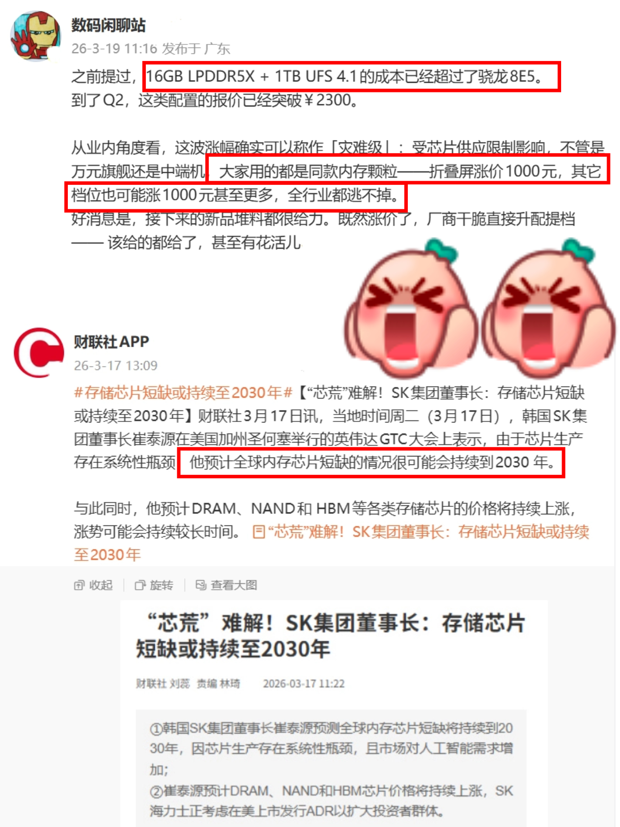 离大谱!行业爆料,目前16GB LPDDR5X + 1TB UFS 4.1的成本已经超过了骁龙8E5!不是兄弟,内存居然比旗舰处理器芯片都贵了,这上哪说理去?