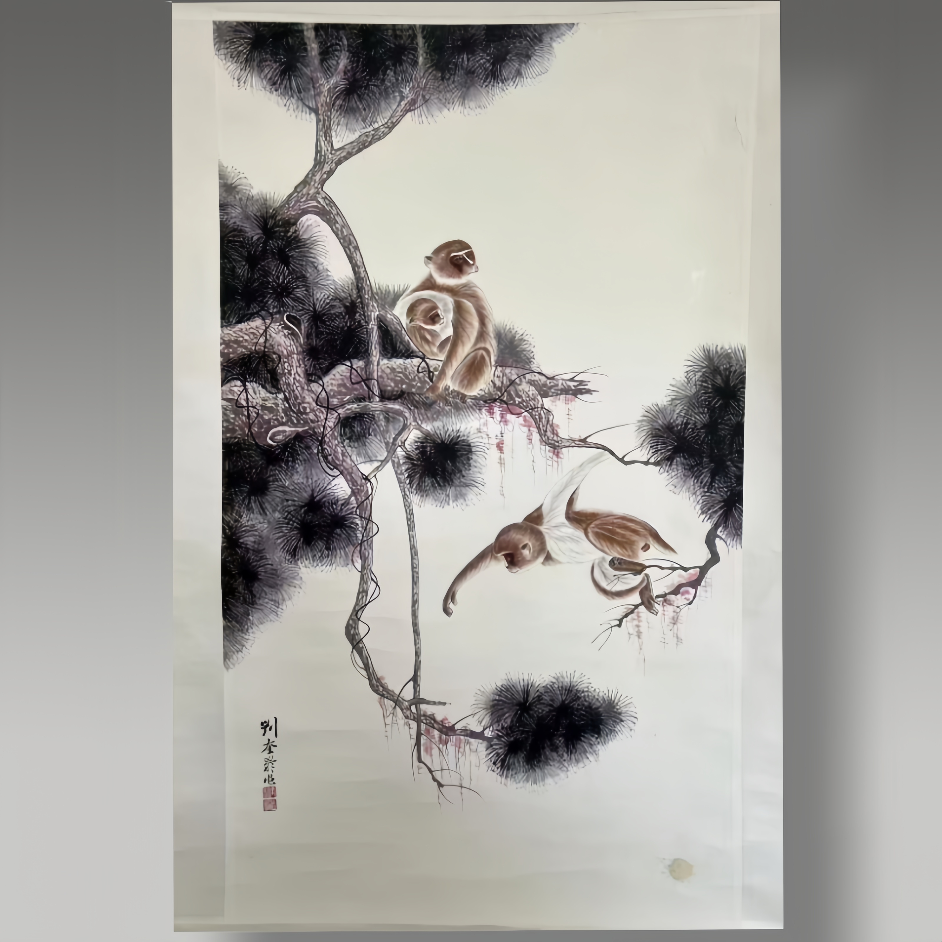 松枝苍劲,灵猴神态鲜活,工笔细腻勾勒毛发肌理,兼具祥瑞寓意与雅致笔墨