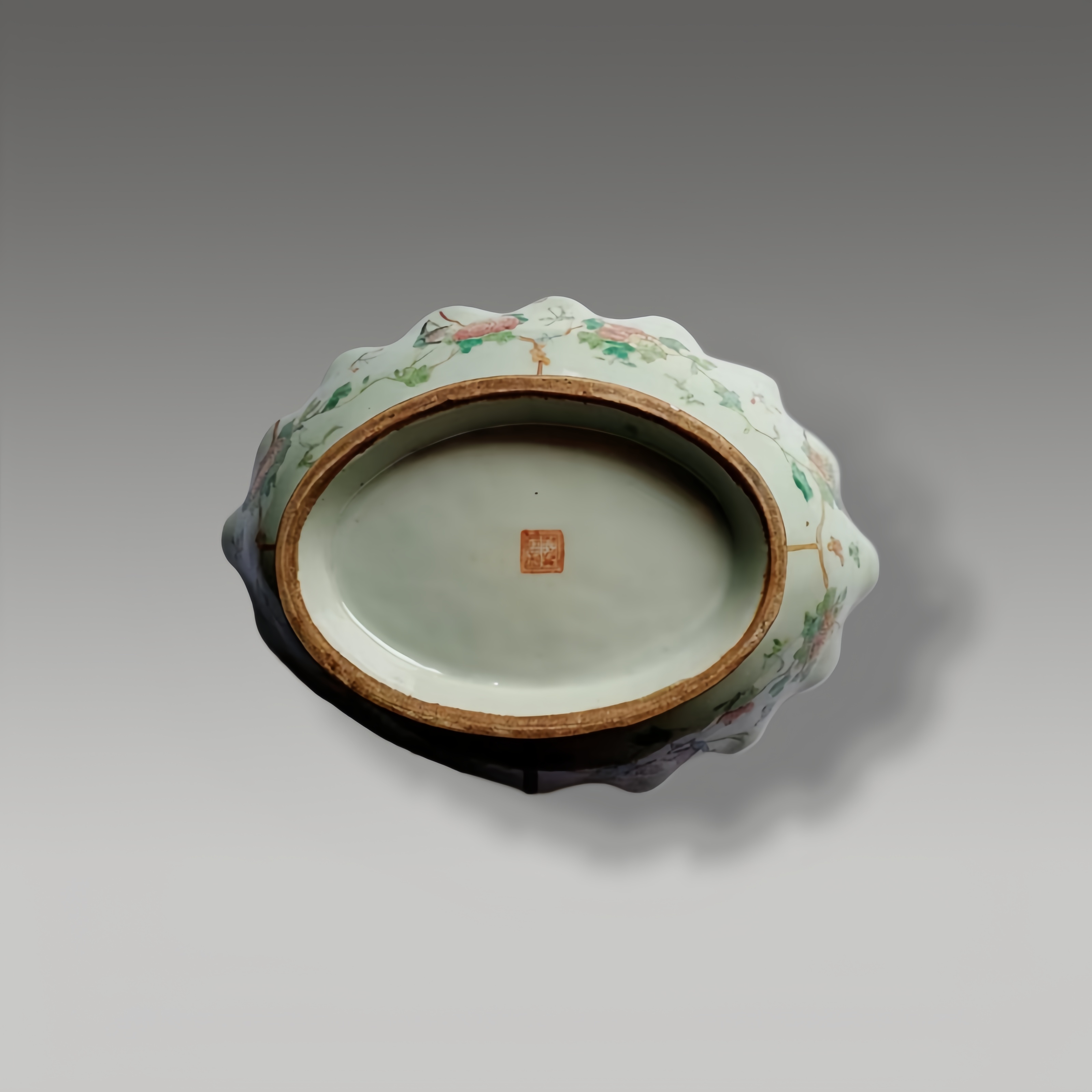 这件豆青釉粉彩花口盘,绘饰花鸟纹样,描金点缀其间,虽经锔钉修复,仍尽显国瓷绘的雅致与岁月沉淀的独特韵味