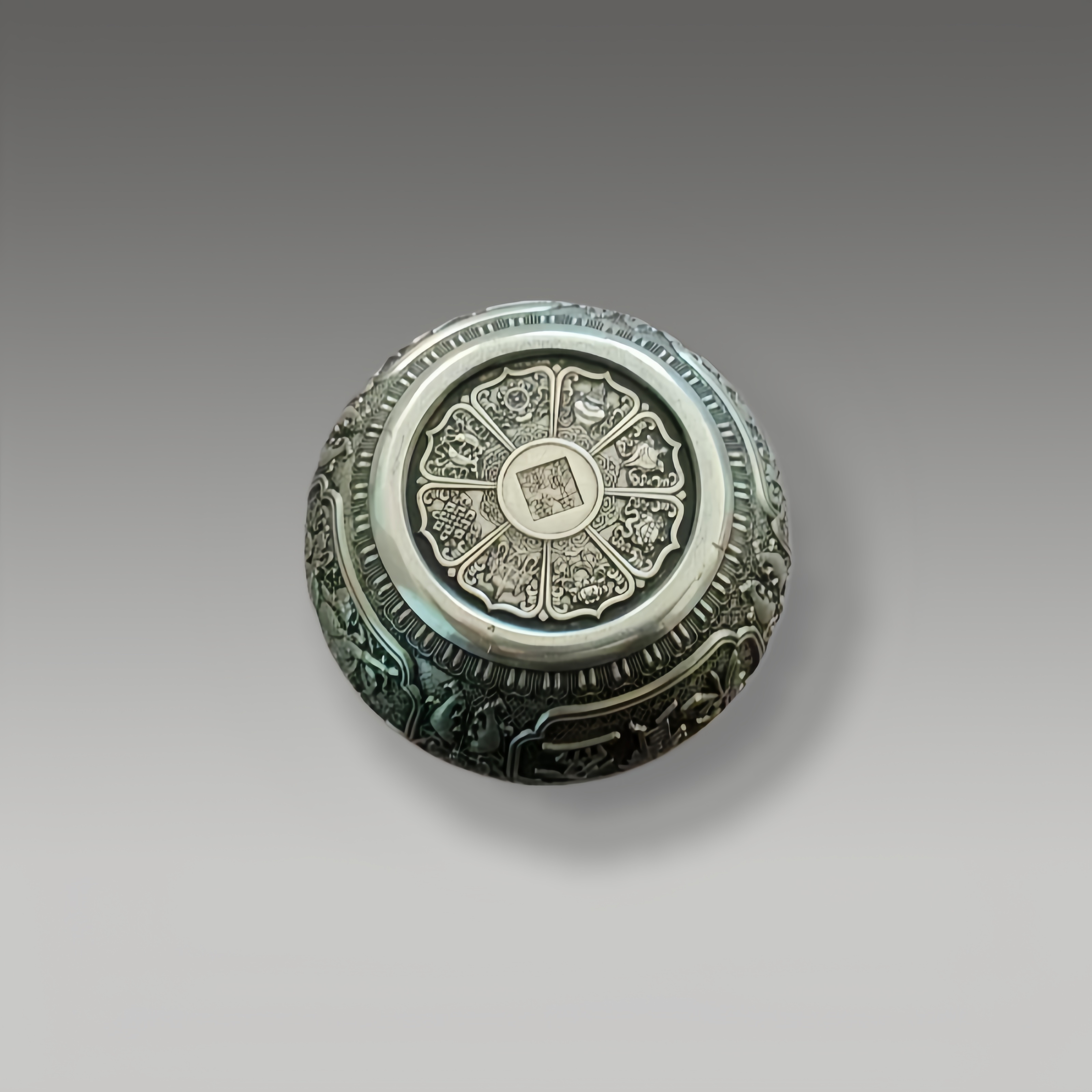 这件银釉龙纹聚宝盆以银胎为底,周身满饰浮雕龙纹,盘心刻绘龙凤呈祥纹样,线条繁复细腻