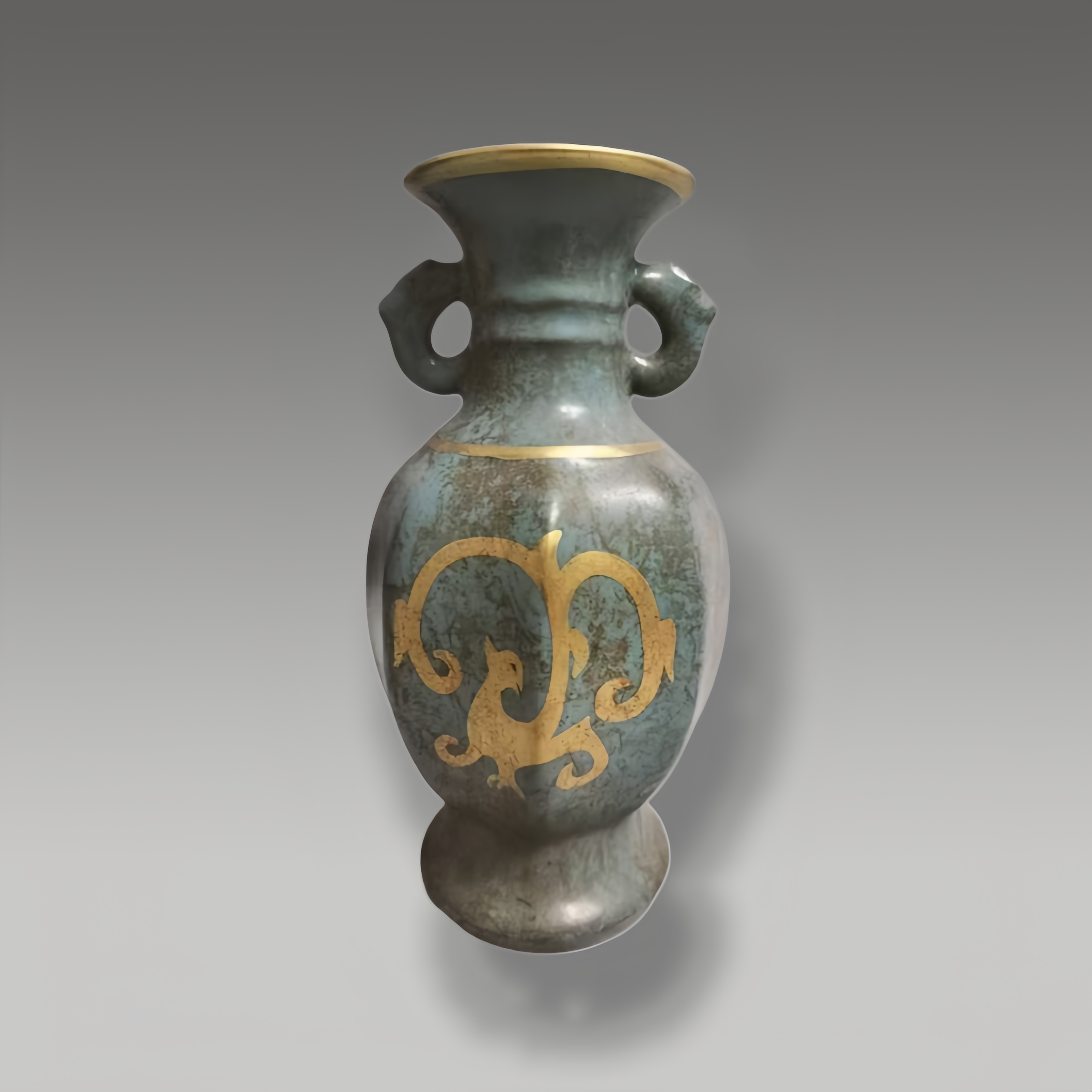 这只青釉描金双耳瓶,釉色温润如古玉,双耳造型灵动,瓶身以金彩勾勒瑞兽纹,线条婉转,描金工艺精湛