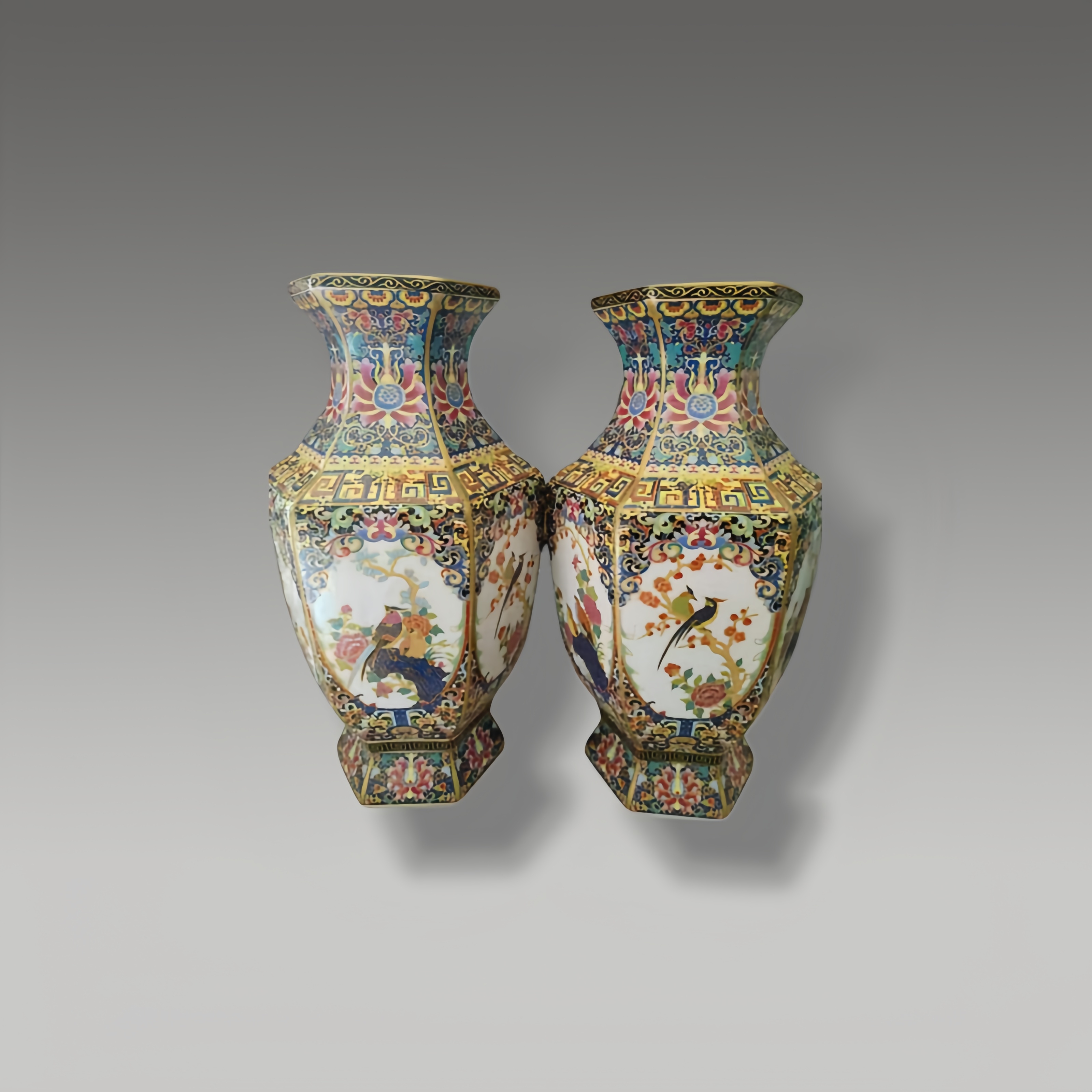这对粉彩开光花鸟纹六方瓶,器型规整,通体以缠枝宝相花铺陈,开光内绘绶带鸟与牡丹