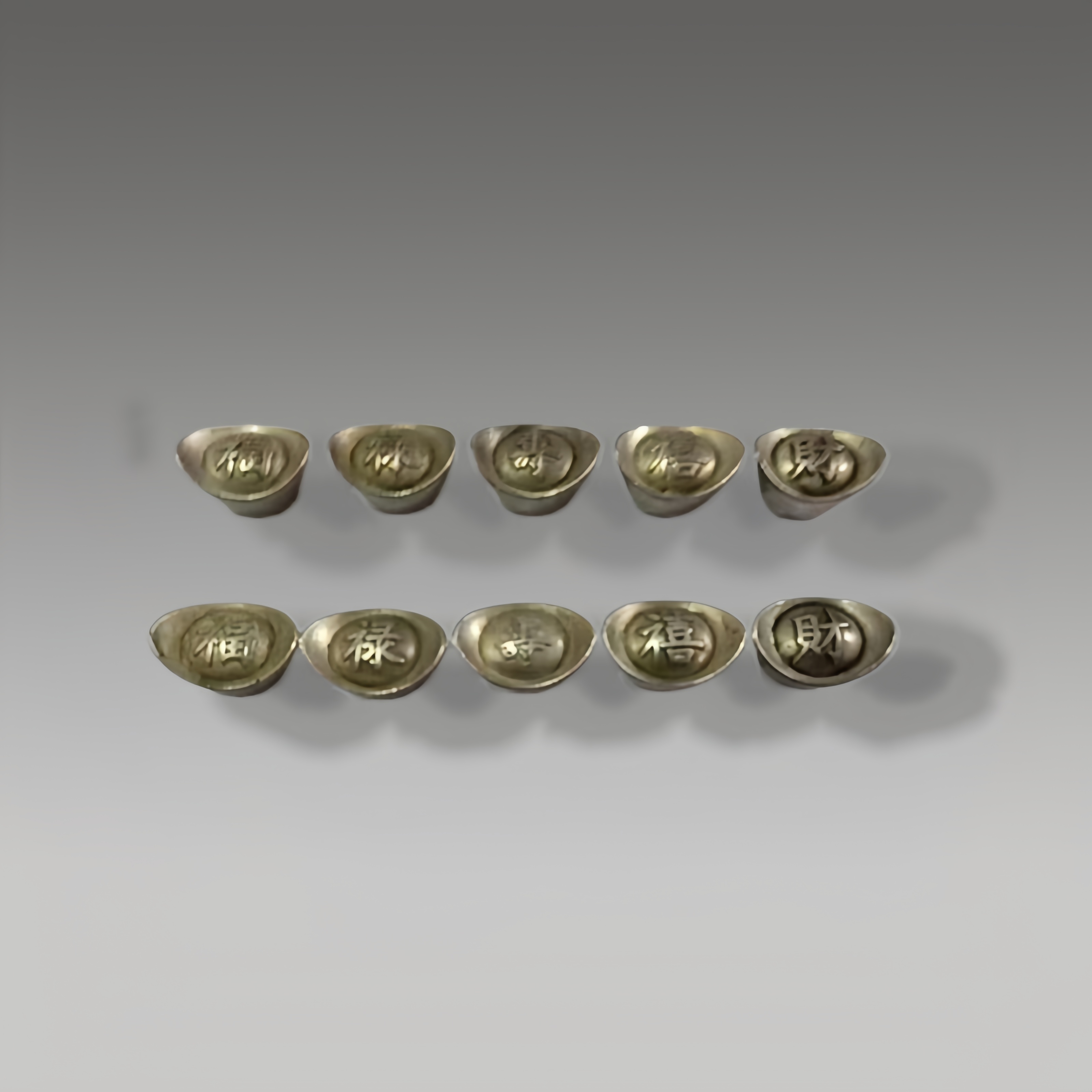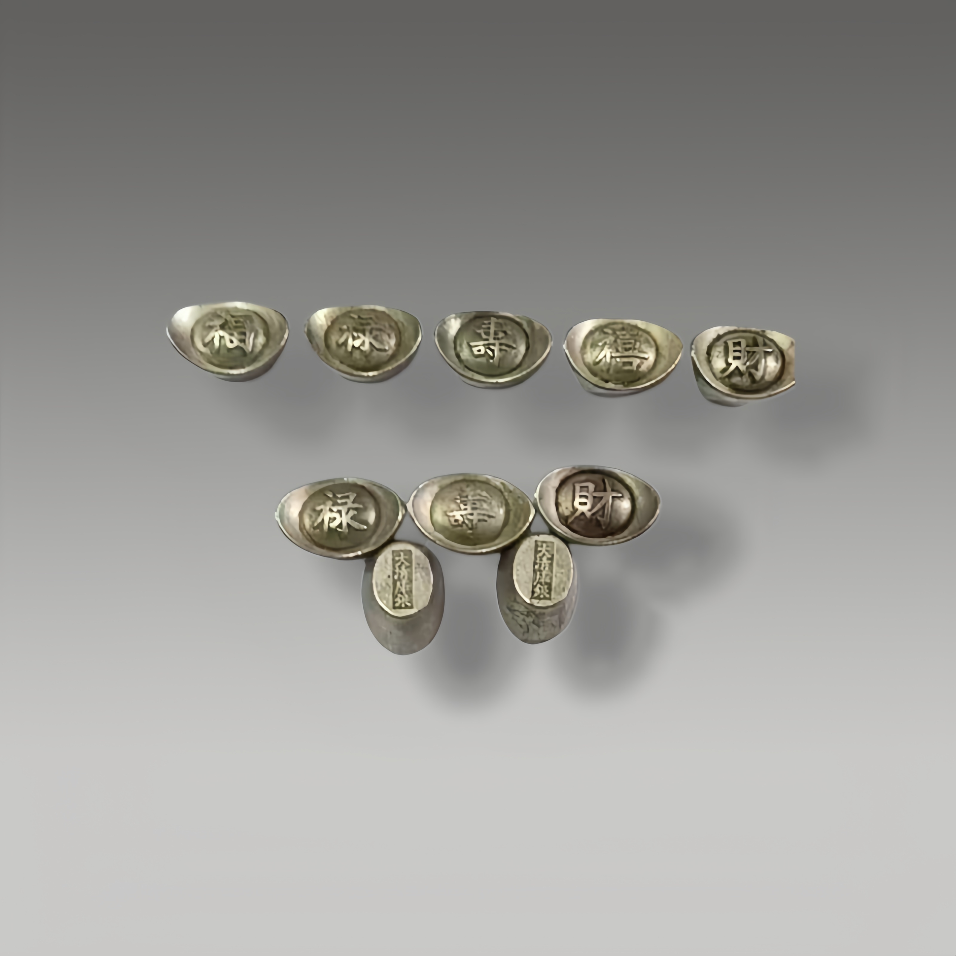 这两排银锭形制规整,“福禄寿喜财”字样清晰,古韵盎然,寓意圆满