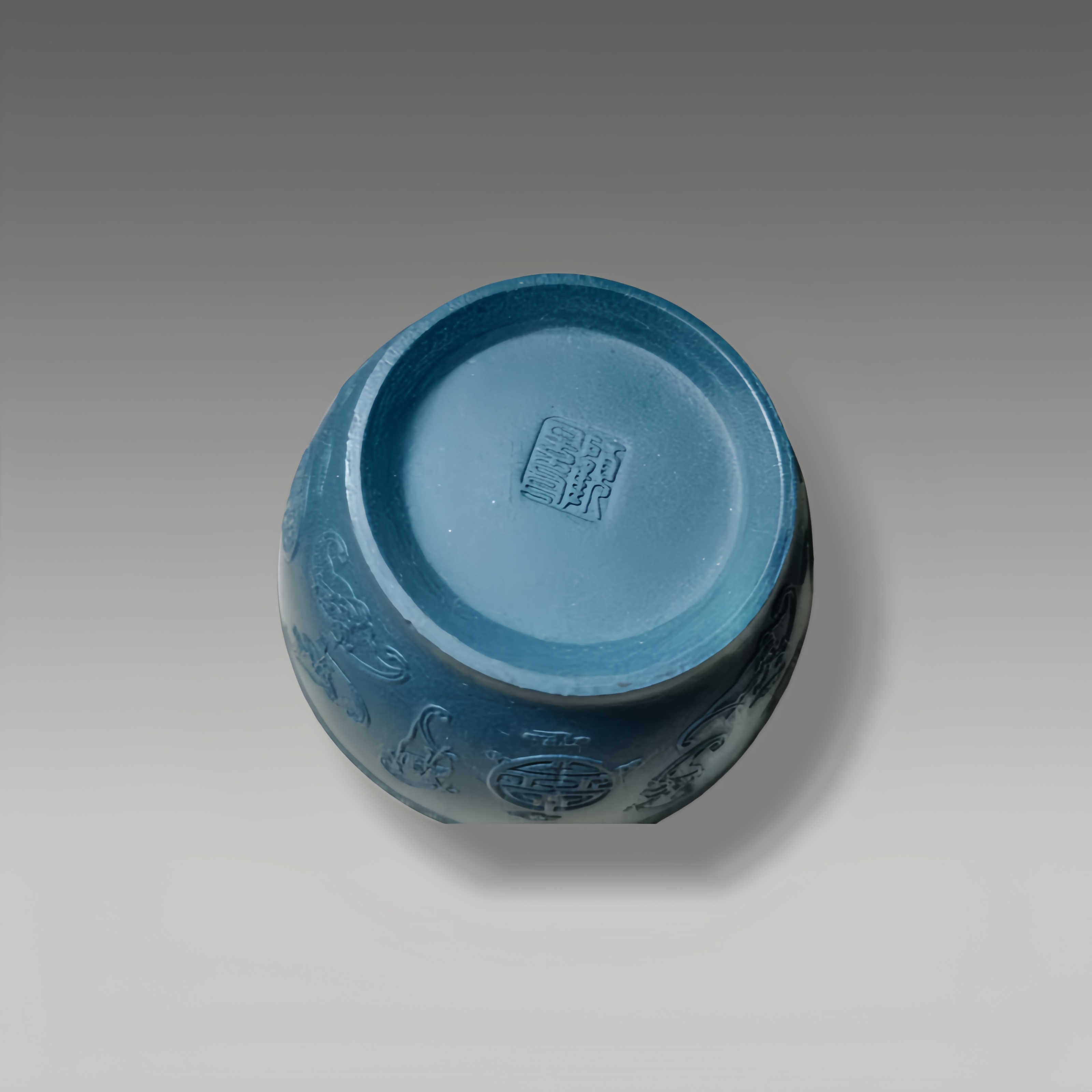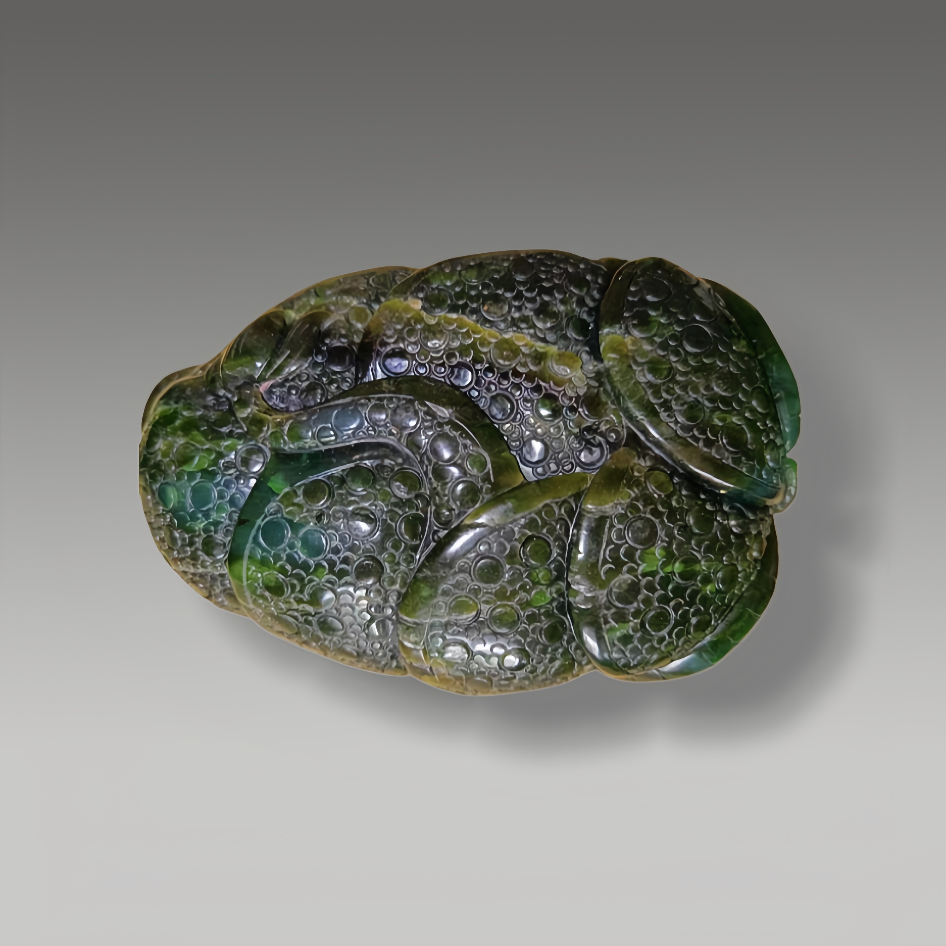 这件藏品以深绿为底,满布圆润凸起纹理,如凝珠聚玉,光泽莹润,造型饱满厚重