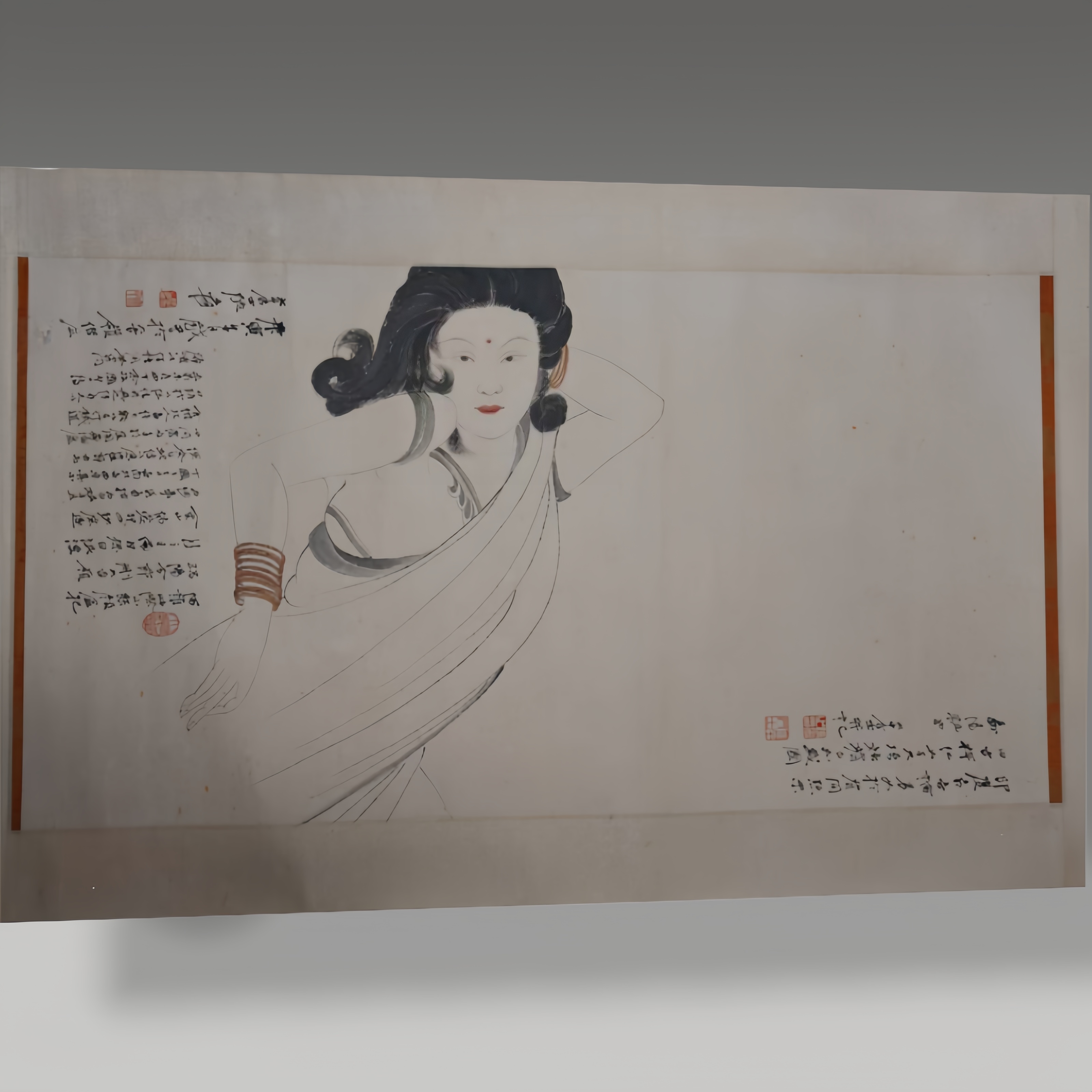 这幅纸本立轴人物画,,以白描勾勒仕女,线条灵动飘逸,辅以题跋与钤印,尽显文人画的清雅格调