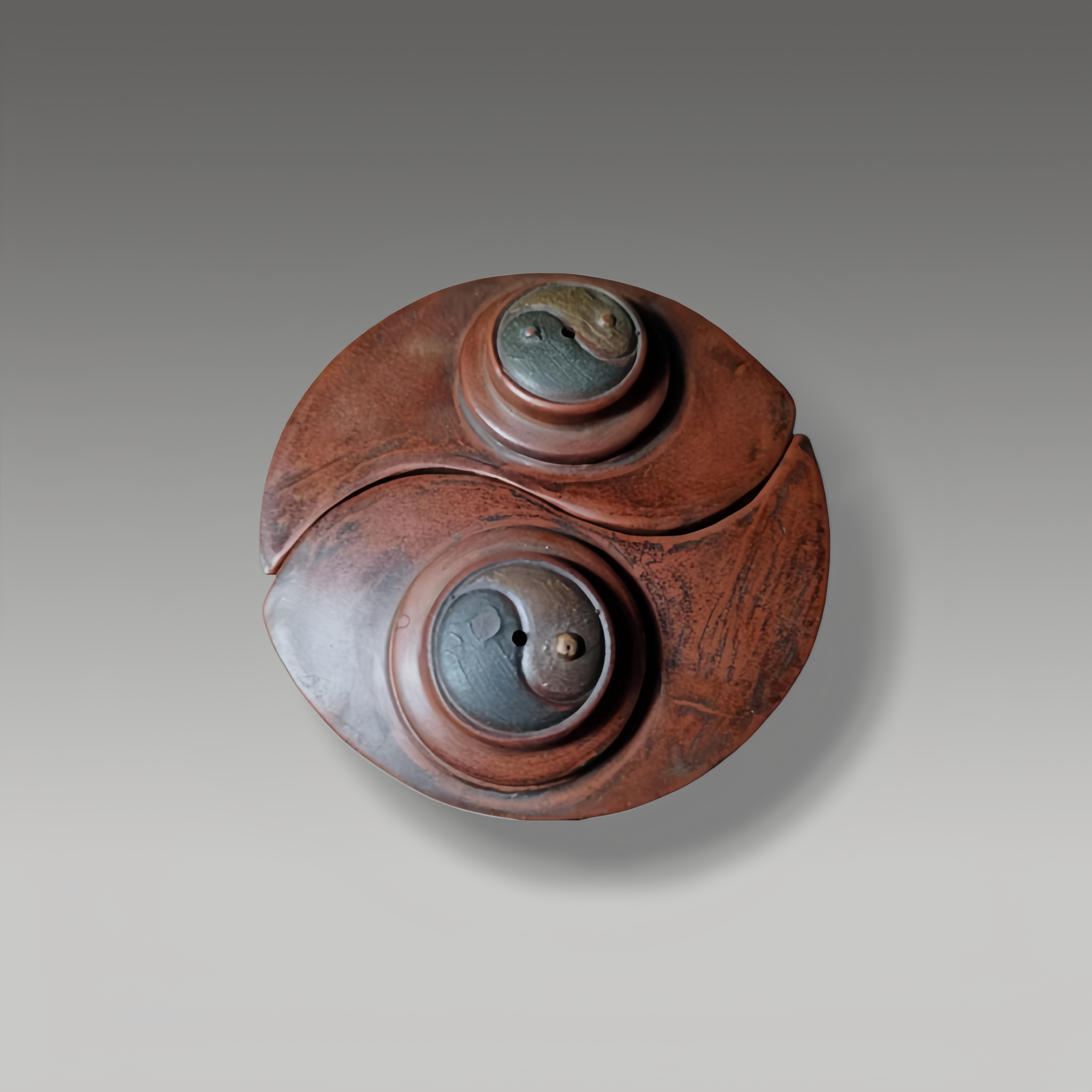 以红泥与黑泥双色搭配,壶身呈太极抱合造型,壶盖嵌阴阳鱼纹,形制精巧