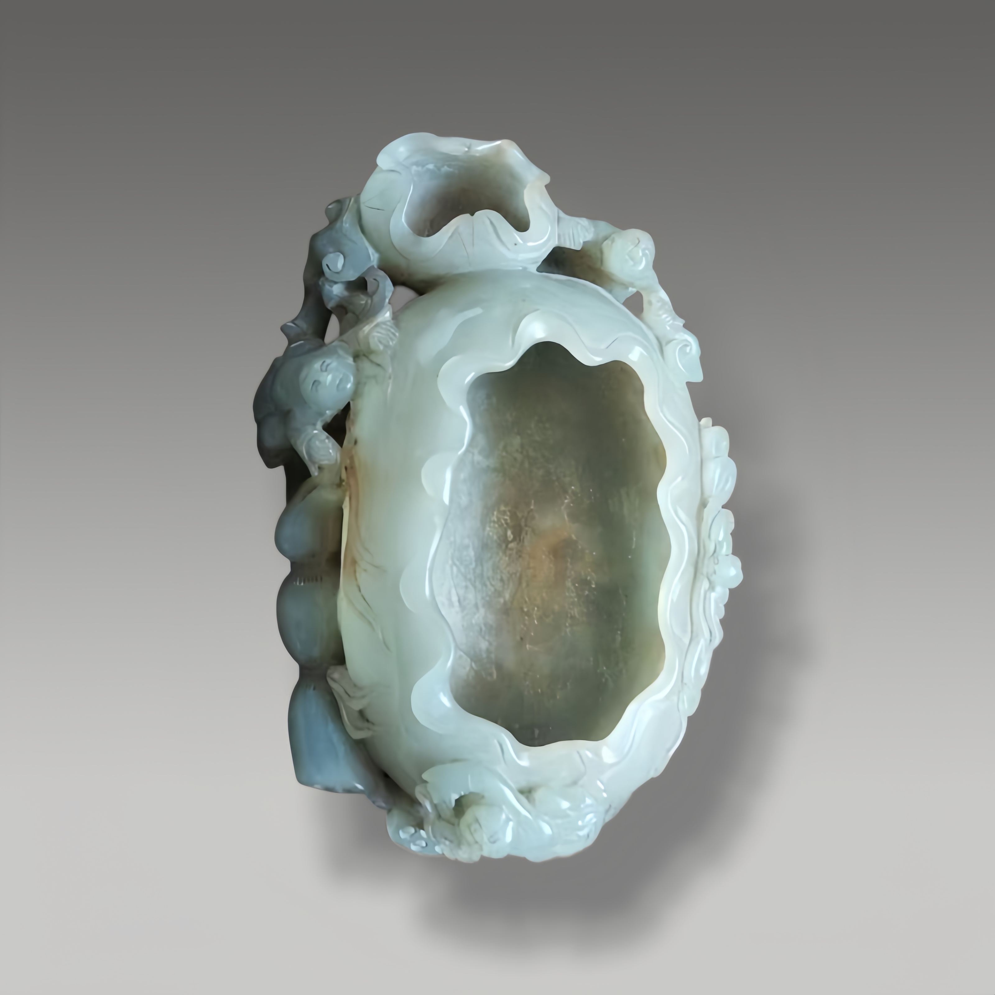 这是一件温润雅致的玉质笔洗,整体以浮雕与透雕工艺雕琢,器身缠枝纹灵动舒展