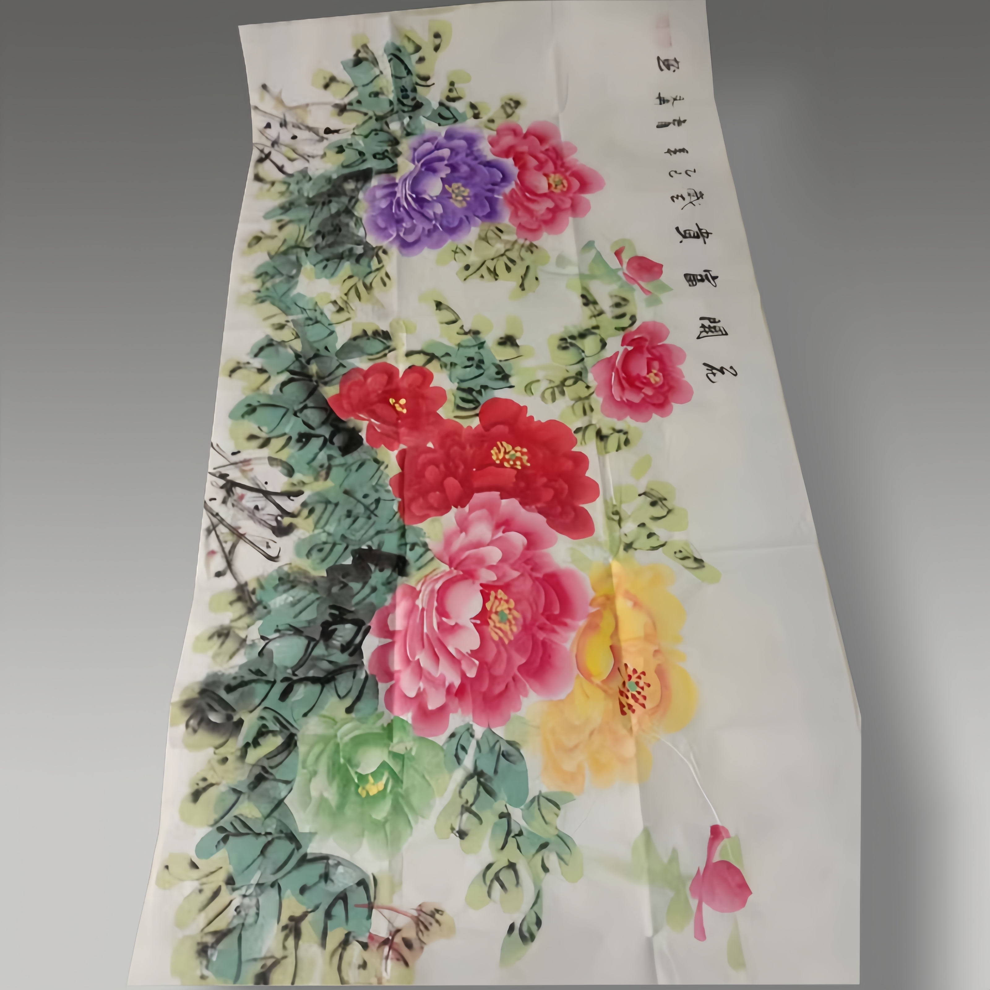 这幅国画以牡丹为主题,色彩浓艳鲜活,红、粉、黄、紫、绿交织绽放,墨色枝叶苍劲灵动