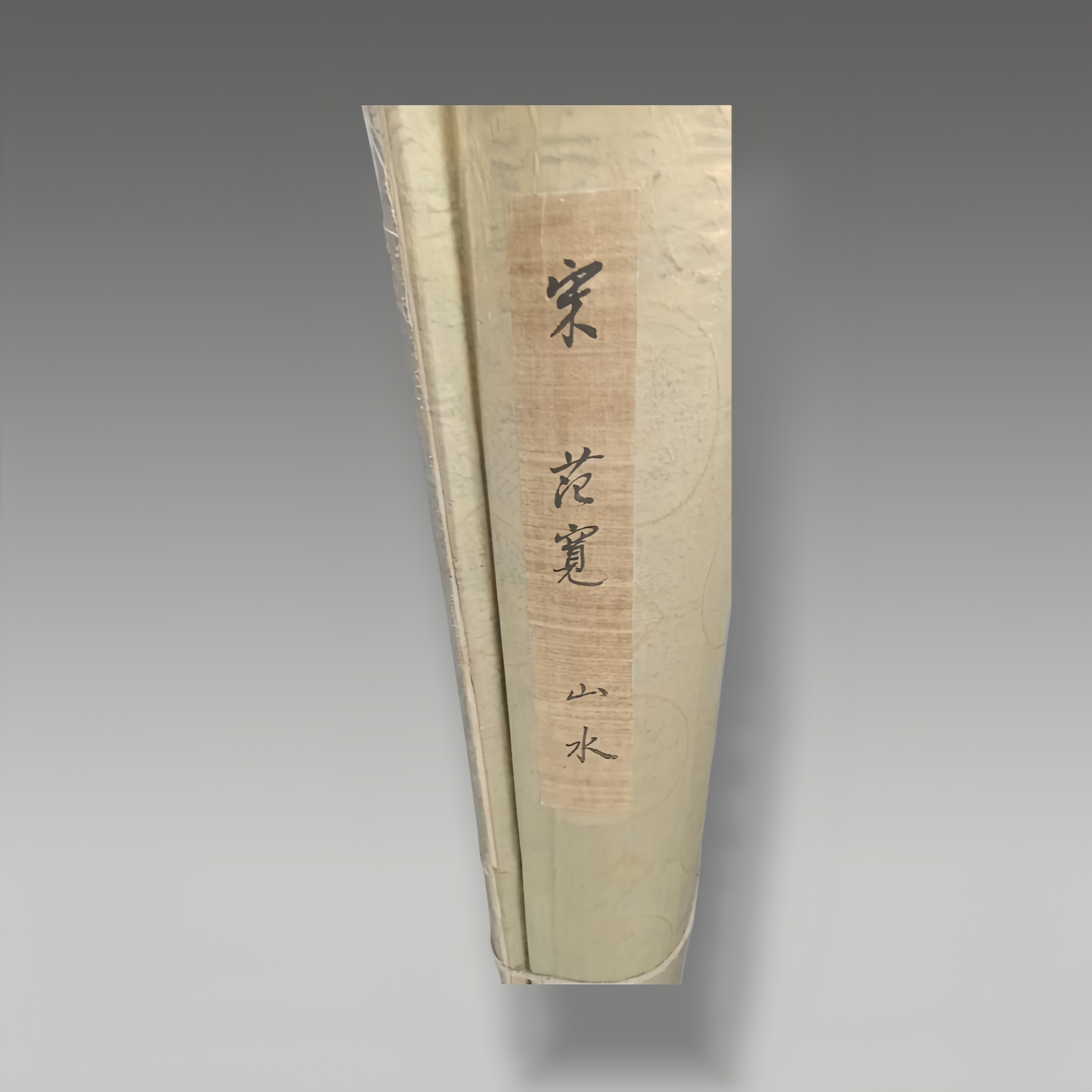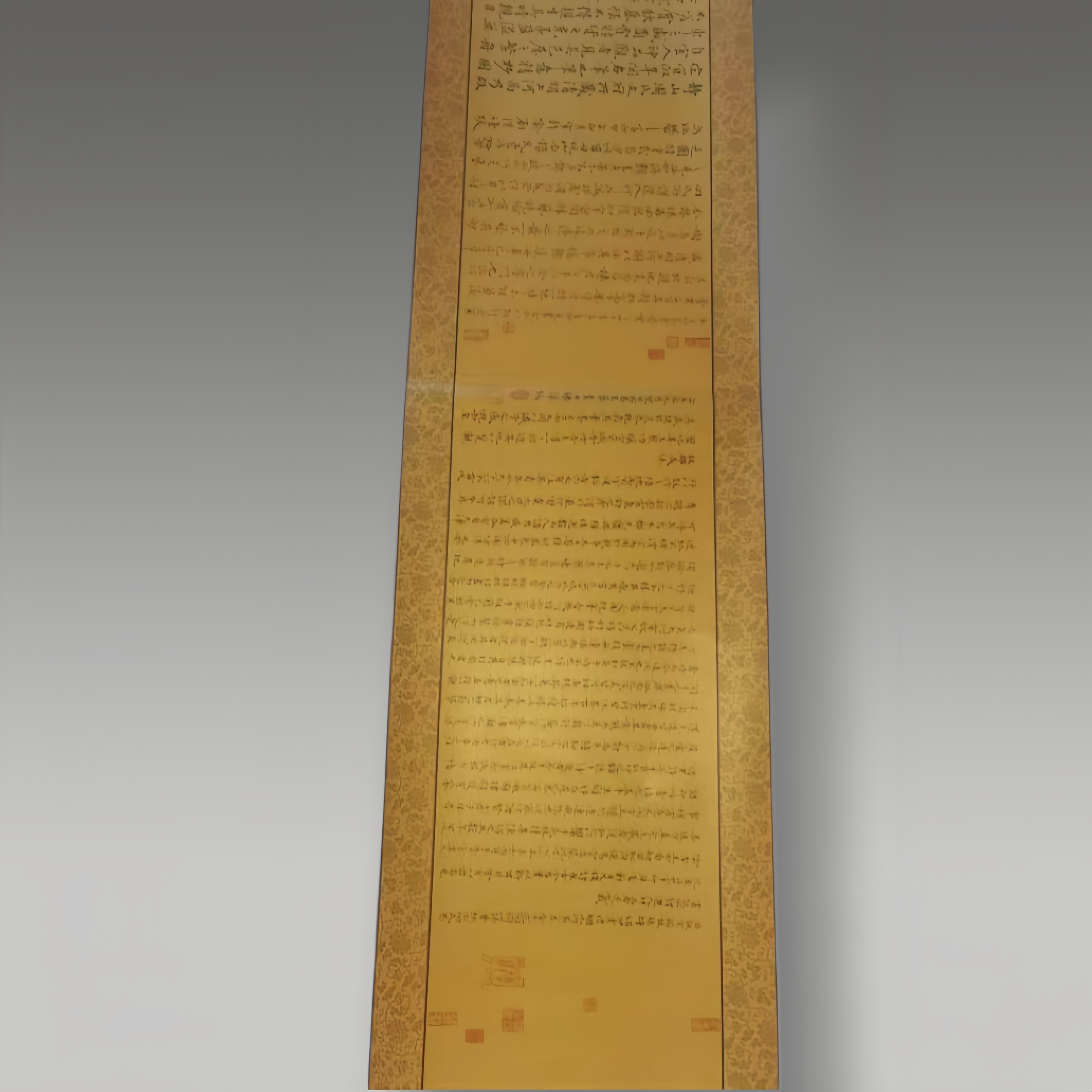 这幅作品以复古赭黄为底,纹理如天然晕染的山水墨痕,两侧金纹镶边雅致庄重。整体气息古拙沉静