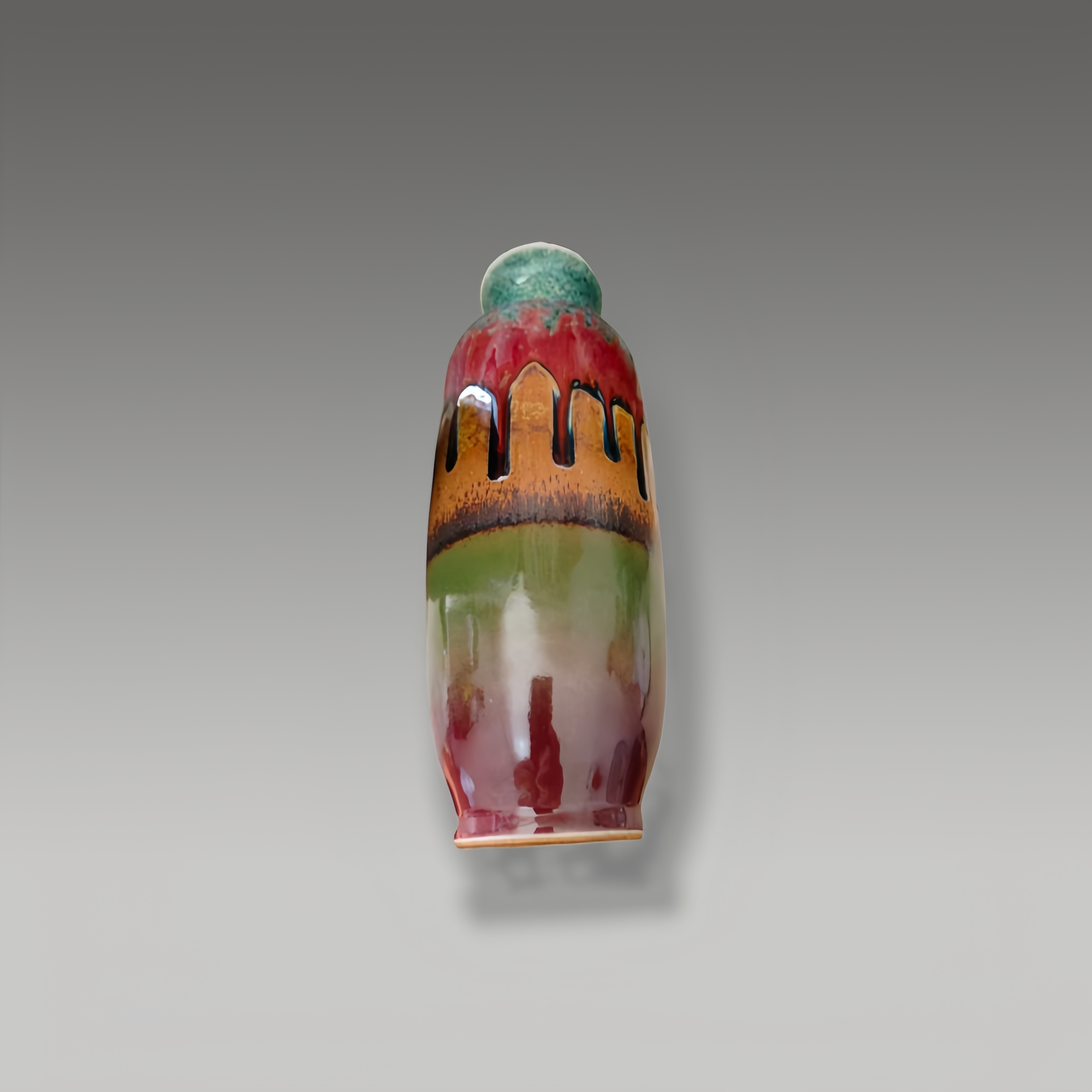 这件钧瓷赏瓶以窑变釉呈现红蓝交融的斑斓色泽,双龙耳造型矫健灵动,瓶身嵌金龙纹圆饰