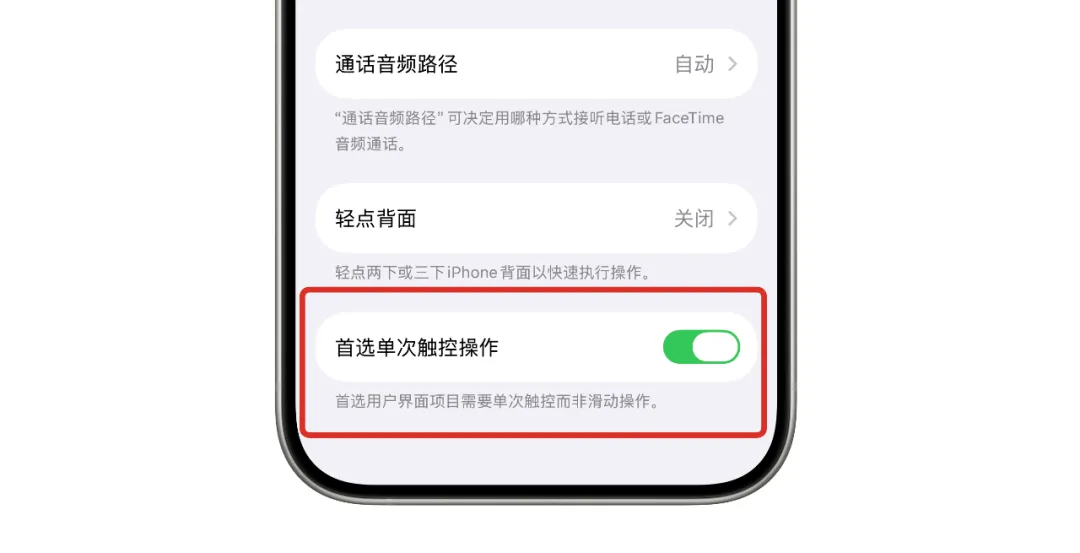 更新 iOS 26.1 Beta 3 后,在 iPhone 设置→辅助功能→触控 界面中,新增了一个名为「首选单次触控操作」的功能开关。