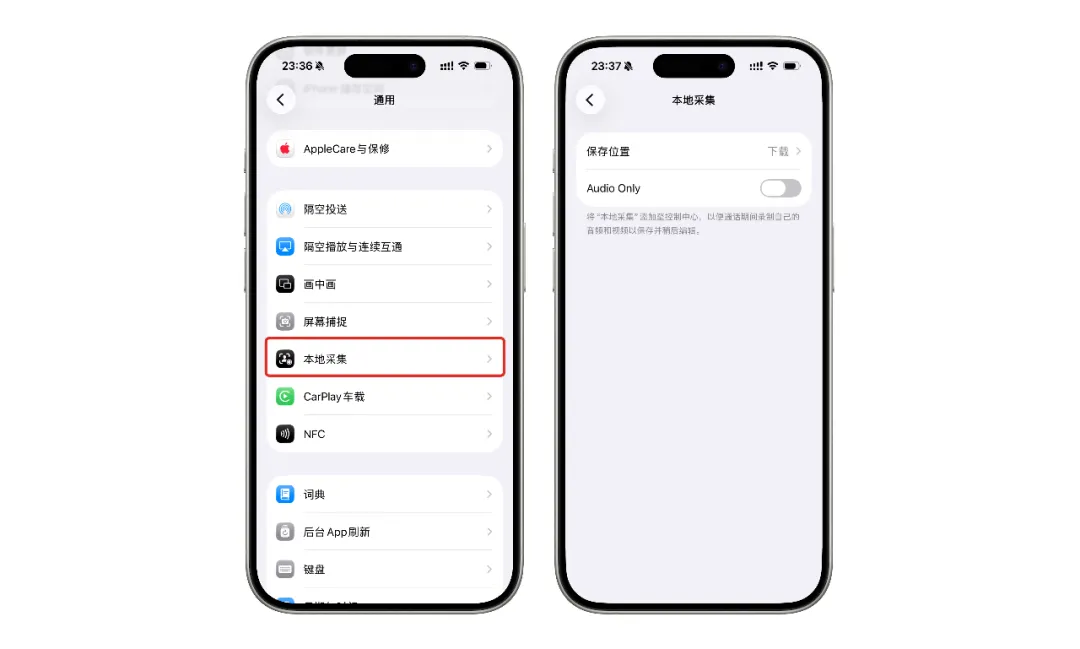 在 iPhone 设置→通用 界面中,新增了「本地采集」选项。