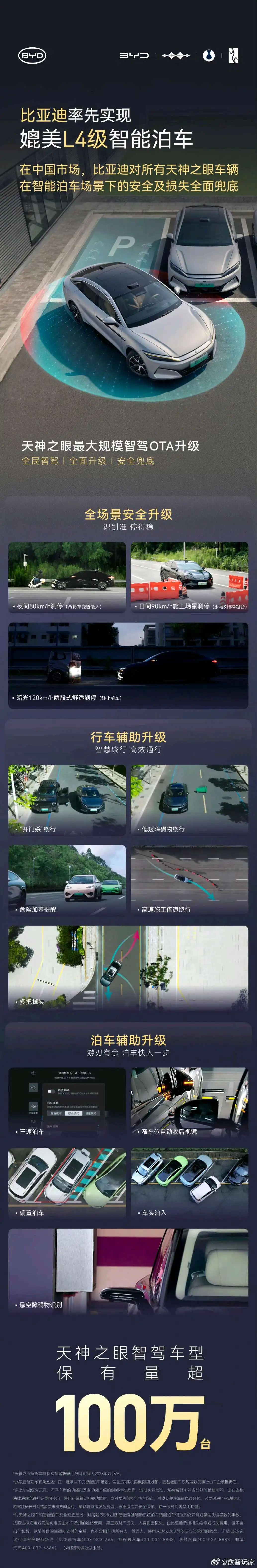 牛了!最近比亚迪又传来重磅消息,泊车不再难!天神之眼迎来了最大规模智驾OTA升级,率先实现媲美L4级智能泊车,怎么来解释这个“媲美L4级”呢?