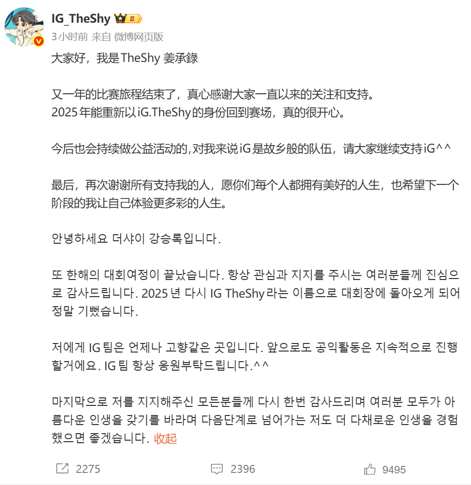 iG官宣了Theshy暂离赛场,随后他也发文跟大家分享了感想,他表示25年能够回归打比赛自己已经很开心了,而自己接下来就要迎接下个阶段! 不过从目前的发言,以及他之前的采访(觉得英雄联盟这个游戏确实有经验是可以继续打的),没有完全说退役,应该还有可能回归吧?当然一切都是未知,至少短时间是看不到这个昔日LPL最受欢迎的男人了!
