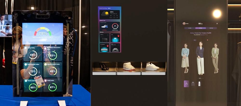 Nuralogix的长寿镜(图源:The Verge)、智能鞋类工具Airet、HEYMIRROR智能化妆镜(从左至右)(图源:CES官网)