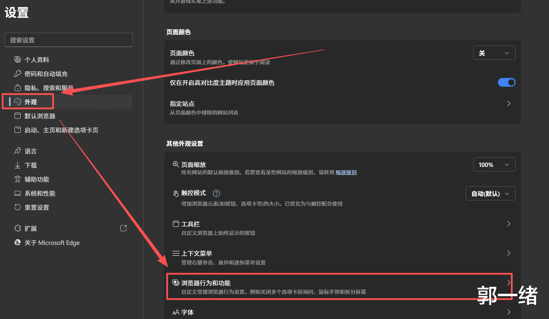 2、在弹出的菜单中,依次选择设置-外观,找到 “浏览器行为和功能” 版块。