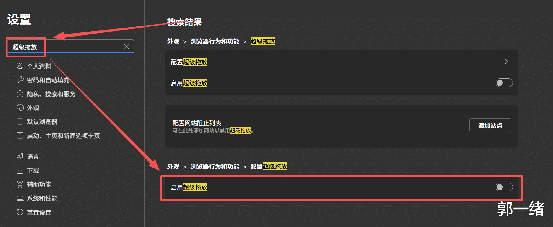 4、若想快速操作,可在浏览器设置页面的顶部搜索框中,直接输入“超级拖放”,即可定位该功能并关闭。