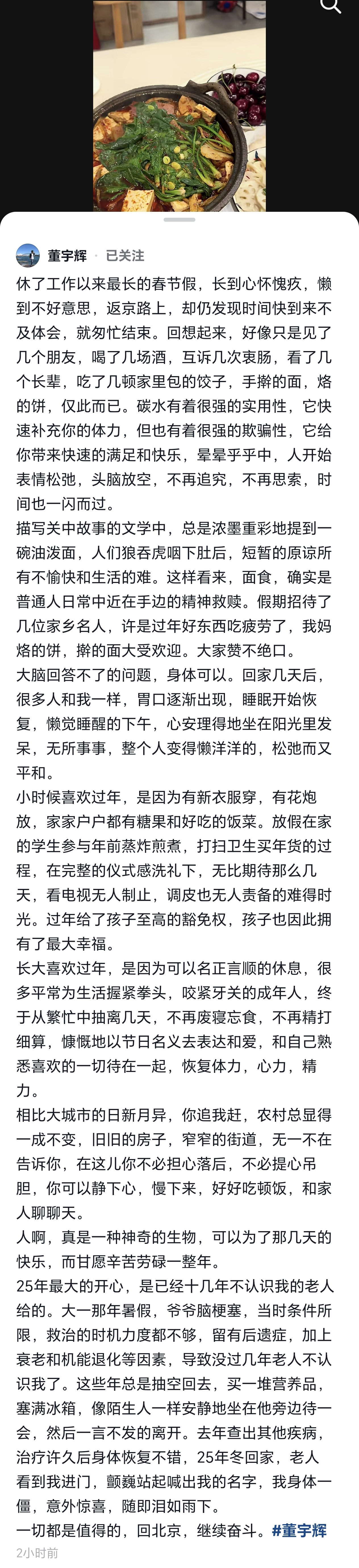 看了宇辉昨晚发的那条长文视频的朋友,应该都知道他是昨晚赶回北京的,并且在回来的路上有感而发地写了一篇1000多字的长文来总结他这个刚结束的春节假期。