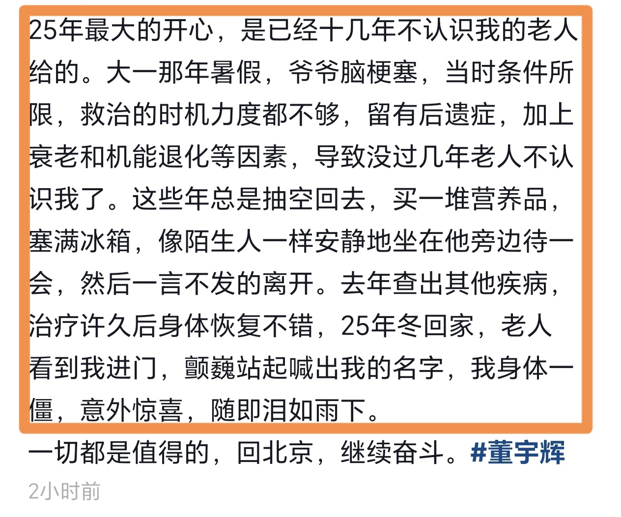 读了宇辉这篇千字长文的网友,相信都不免被感动到,特别是宇辉写他爷爷那段,更是看后不免泪目,宇辉把爷爷能认出他定义为“2025年最大的开心”,可见他跟自己爷爷的深厚感情,而且从这段文字里,才知道他爷爷在他都大一的时候就突发脑梗,并因救治不及时留下了后遗症,导致后面没过几年就开始不认识他这个大孙子了,所以随后好多年宇辉回家老爷爷都没法交流,只能像陌生人一样陪他坐会就一言不发地离开,相信那段时间宇辉每次面对他爷爷内心都是非常充满难过和愧疚的。而在去年冬天,宇辉有一次回家时,爷爷看到他进门竟然能喊出他的名字,于是意外惊喜地泪如雨下…