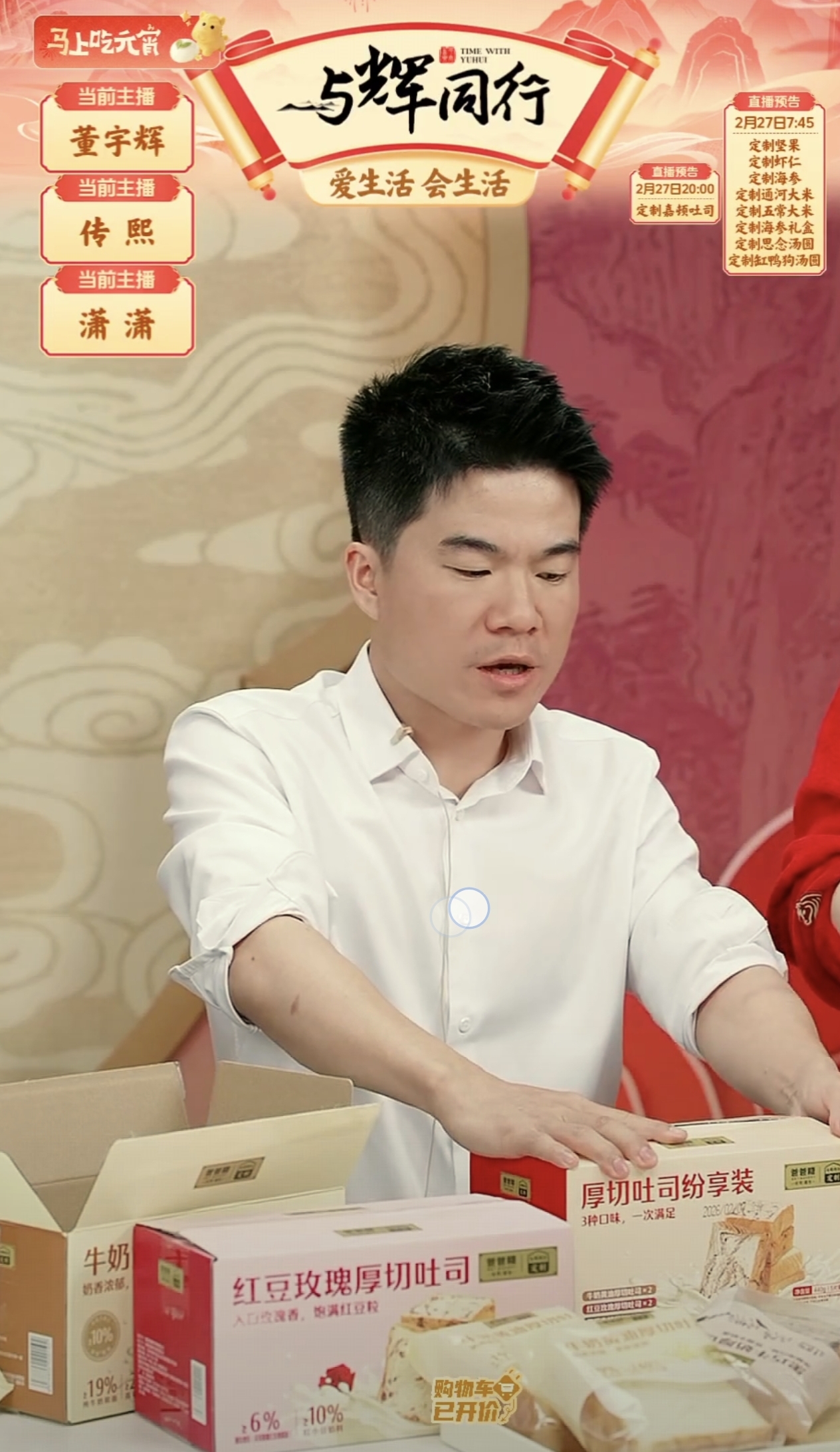 宇辉今晚是在20点传熙和潇潇正在交接班时,突然闪现直播间的,当时传熙和潇潇正在给大家推荐爆品“定制吐司”,于是宇辉进入直播间后也开始品尝起了,这款虽说已经上架了好几个月却依旧供不应求,需要限购的畅销“定制爆品”。