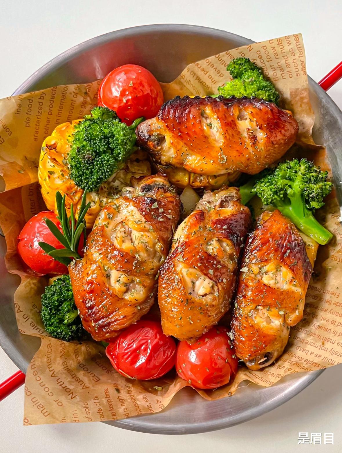 鸡翅中:8-10个西兰花:1颗小番茄:适量 (约150-250克)增香蔬菜(可选)贝贝南瓜:1个玉米:1根口蘑:200克胡萝卜:1根腌料(鸡翅)生抽:2勺料酒:1勺 蚝油:1勺 蜂蜜:1勺 老抽:半勺 (可选,为上色)黑胡椒碎:适量蒜瓣:适量调味料(蔬菜)橄榄油(或普通食用油):1-2勺 盐:适量 黑胡椒碎:适量1. 在鸡翅两面划上几刀,这样能更好地入味。将鸡翅放入碗中,加入2勺生抽、1勺料酒、1勺蚝油、1勺蜂蜜、半勺老抽和适量的黑胡椒碎与蒜片。用手抓匀后,密封腌制至少30分钟,如果时间充裕,腌制1小时风味更佳。2. 将西兰花掰成小朵,焯水约2分钟后捞出,这样可以保持其翠绿的色泽和爽脆的口感。小番茄洗净,其他蔬菜如南瓜、胡萝卜等切成均匀大小的块状。将所有蔬菜放入一个大碗中,加入1-2勺橄榄油、适量的盐和黑胡椒碎,抓拌均匀,使蔬菜表面均匀裹上油和调味料。3.将烤箱预热至180-200°C。先把鸡翅和比较难熟的蔬菜(如南瓜块、胡萝卜块、玉米段)平铺在铺了锡纸或烘焙纸的烤盘上,确保食物间留有间隙。先烤15-20分钟,然后取出烤盘,给鸡翅翻面,并刷上一层蜂蜜水。接着放入西兰花和小番茄,继续烤10-15分钟,直到鸡翅全熟、表皮金黄酥脆即可。使用空气炸锅将空气炸锅预热至180°C。同样先放入鸡翅和耐烤的蔬菜(如南瓜、玉米),烤10分钟后取出翻面。再烤5分钟后,放入西兰花和小番茄,继续烤5-10分钟即可。鸡翅表面划刀后,腌制时间要充分。短暂的腌制(如15-20分钟)可使其表面有滋味,而腌制1小时左右能更入味。西兰花焯水后再烤,能更好地保持爽脆口感和鲜亮颜色。小番茄和西兰花这类易熟的蔬菜要后放,避免过度软烂。用空气炸锅制作时,由于热风循环效率高,食材更容易呈现焦香酥脆的效果,且用时可能略短。用烤箱制作时,食材平铺不叠放能确保受热均匀。出炉后可以撒上一些欧芹碎、辣椒粉等增加风味。腌制鸡翅时,也可以根据喜好加入少许辣椒粉或奥尔良腌料,变换不同口味。希望这份详细的指南能帮助你做出一盘美味成功的鸡翅烤西兰花番茄!祝你用餐愉快。