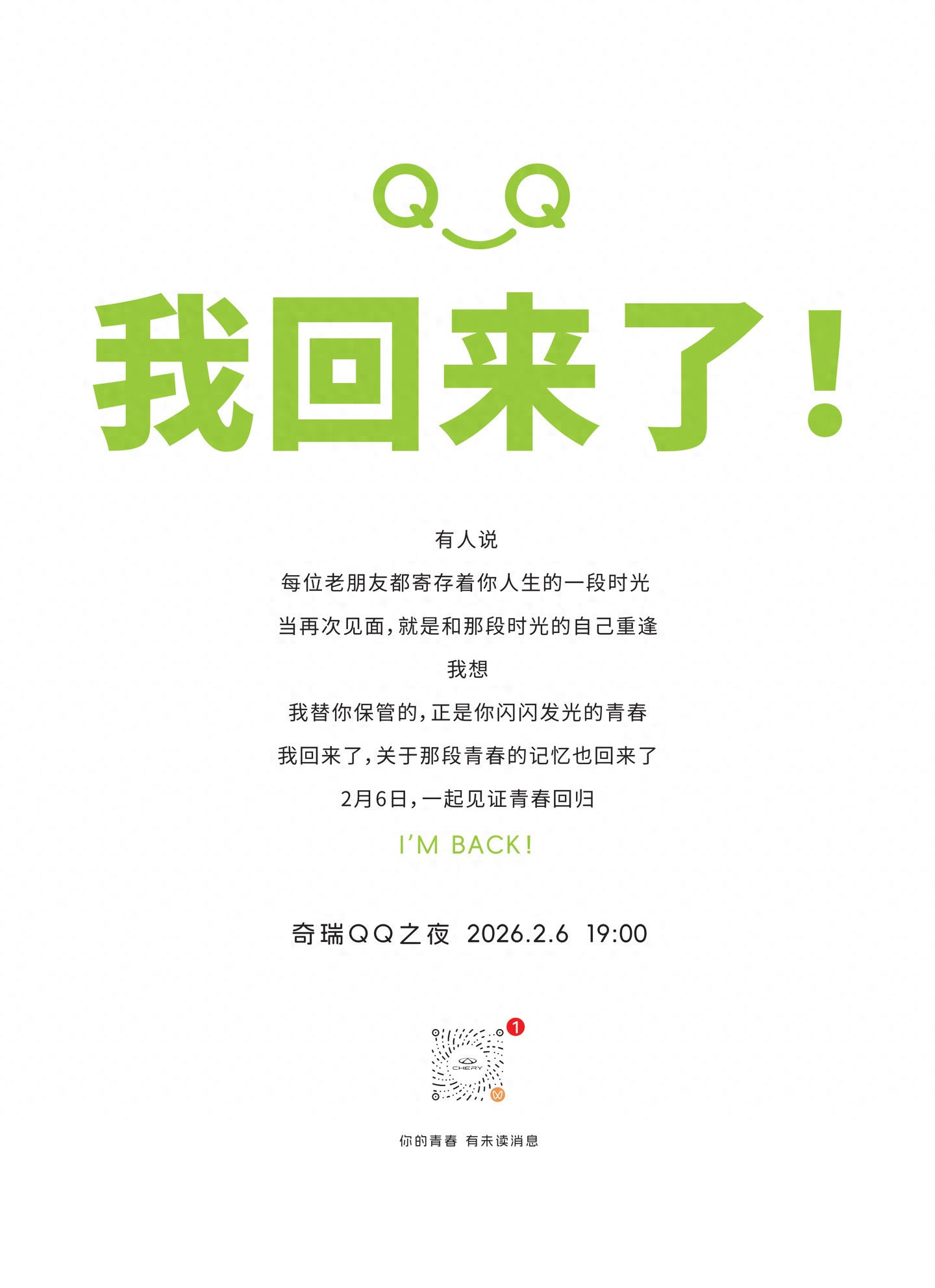 2 月 3 日消息,奇瑞汽车今日宣布“奇瑞 QQ 正式回归”,并将于 2 月 6 日举办“奇瑞 QQ 之夜”活动。