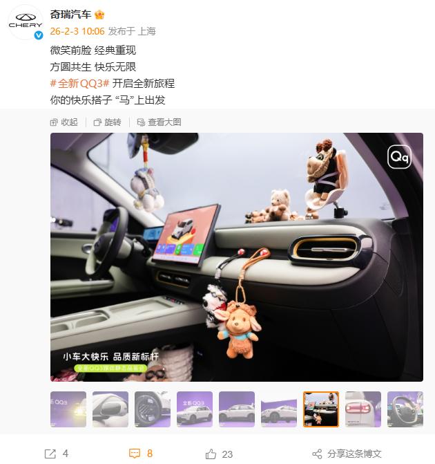 与此同时,奇瑞今日还公布了“全新 QQ3”车型的一组官方照,新车预计 2 月 6 日正式亮相。