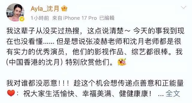 第二步:正式声明厘清核心。随后发布的长文里,她明确三点:一是 “这辈子从没买过热搜,这点必须要说清楚”,直接否认炒作质疑;二是坦言对事件始末 “没看懂”,强调 “对谁都没恶意”;三是公开欣赏张凌赫与内地演员沈月,称赞两人是 “很优秀的同行”,主动避免粉丝对立。
