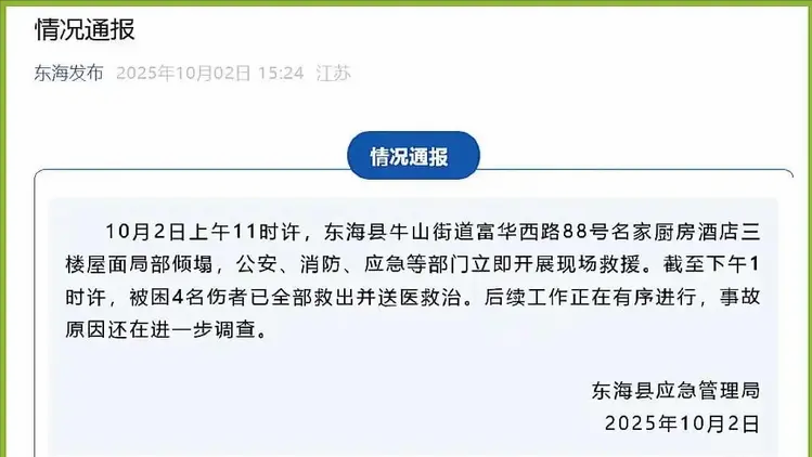 据媒体报道,2025 年 10 月 2 日上午 11 时许,江苏省连云港市东海县富华西路 88 号 一家名为 “名家厨房酒店”张灯结彩,4对新人正在举办婚礼,突然间三楼屋面突然局部发生倾塌,水泥块夹杂着吊顶材料瞬间坠落,发生意外。