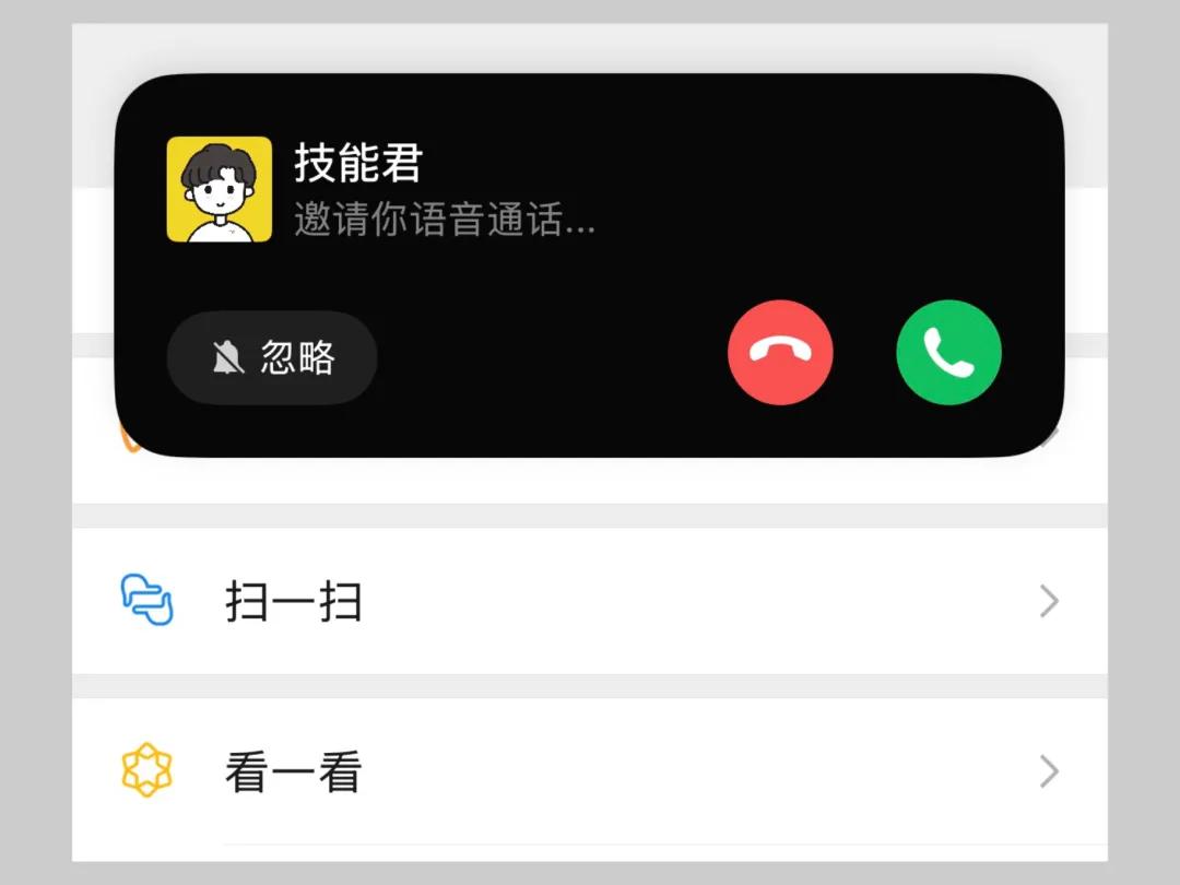 当微信收到好友发起的语音或视频通话后,弹窗中新增了一个“忽略”的新按钮。