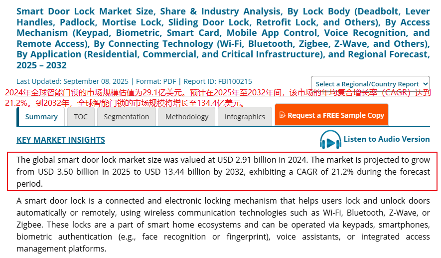 据fortunebusinessinsights数据显示,2024年全球智能门锁的市场规模估值为29.1亿美元。预计到2032年,全球智能门锁的市场规模将增长至134.4亿美元。