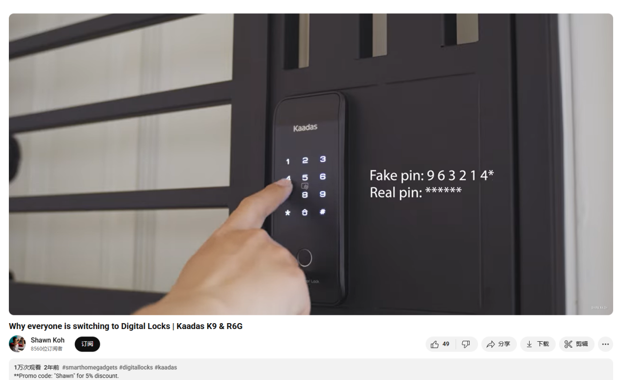 像科技博主Shawn Koh便跟Kaadas品牌合作,为Kaadas K9这款智能门锁拍摄了一条评测视频。