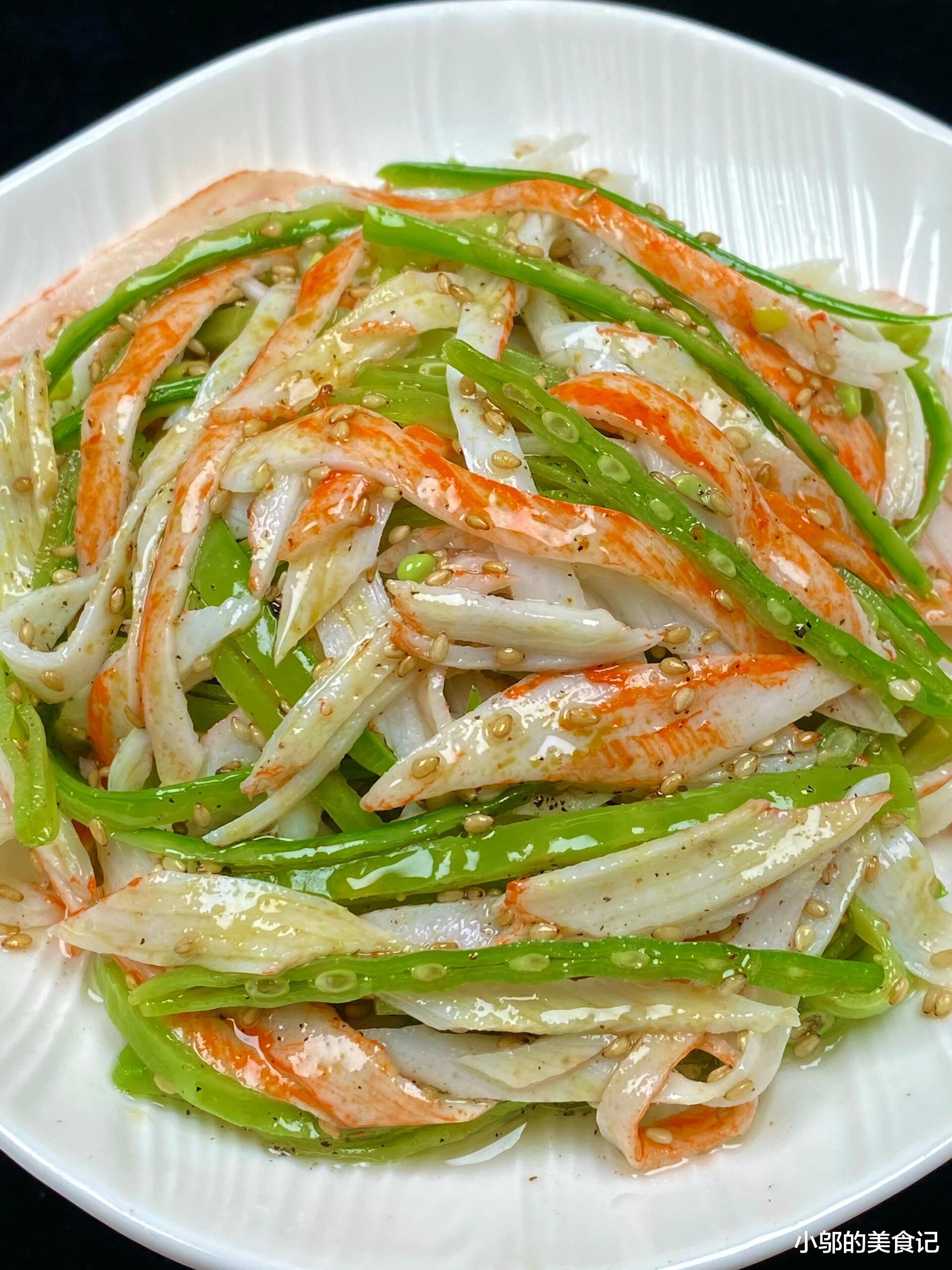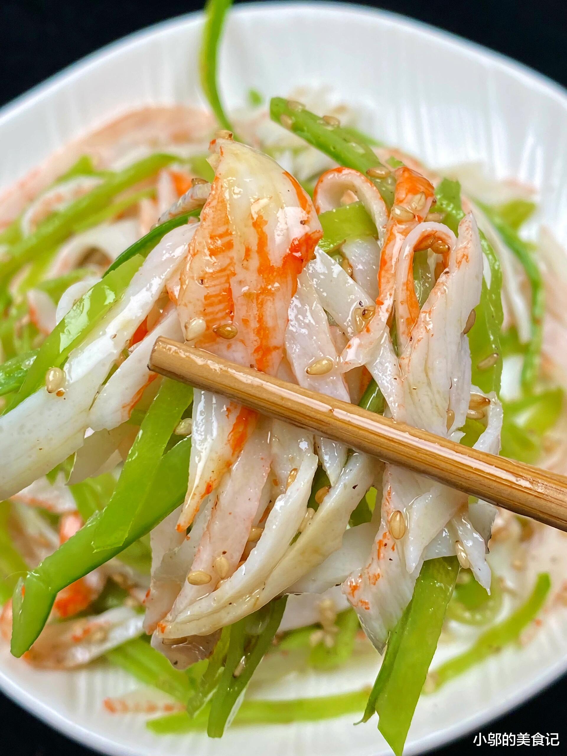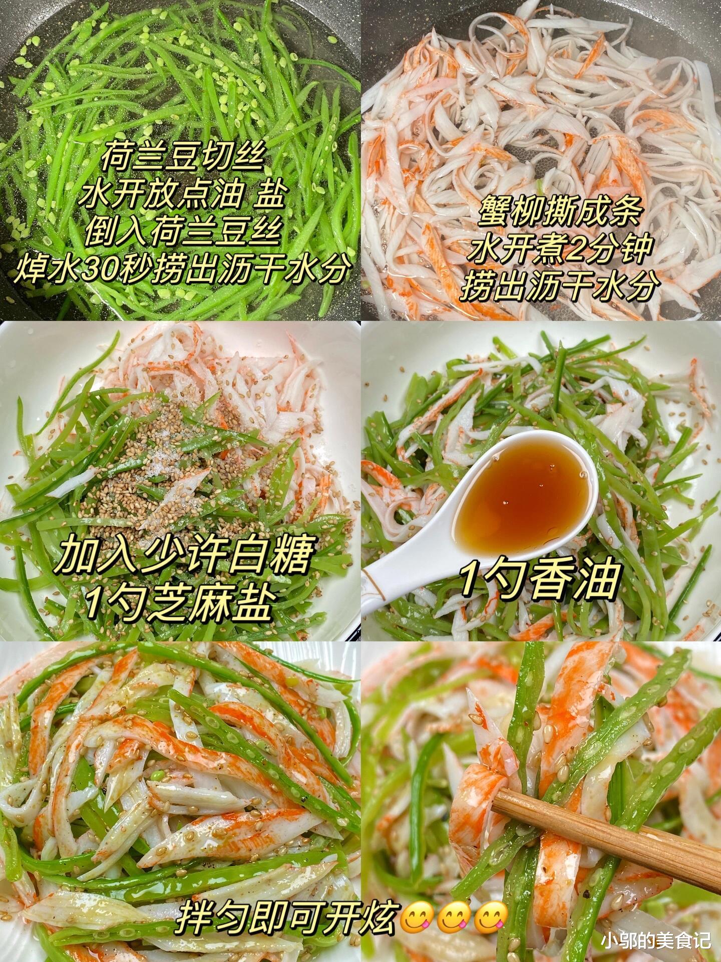 这道菜的妙处在于,荷兰豆的脆嫩和蟹柳的软嫩形成对比,口感层次丰富。白糖的甜味、芝麻盐的咸香、香油的醇厚,层层叠加,每一口都带着清新的豆香和淡淡的海味。而且做法简单,食材也常见,是家常菜里的经典款。