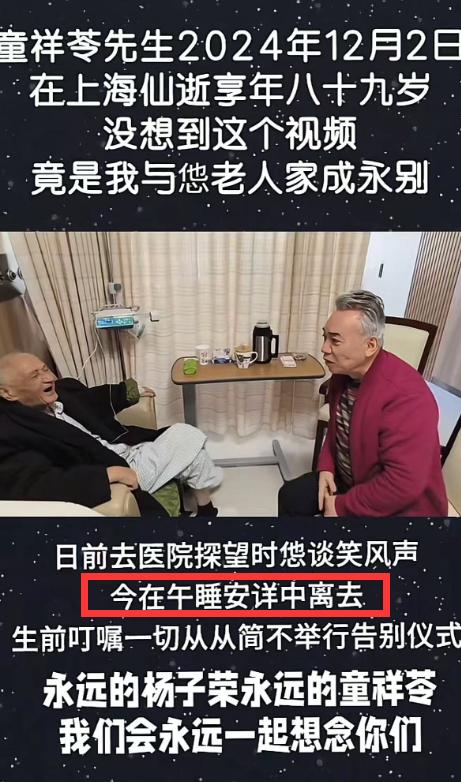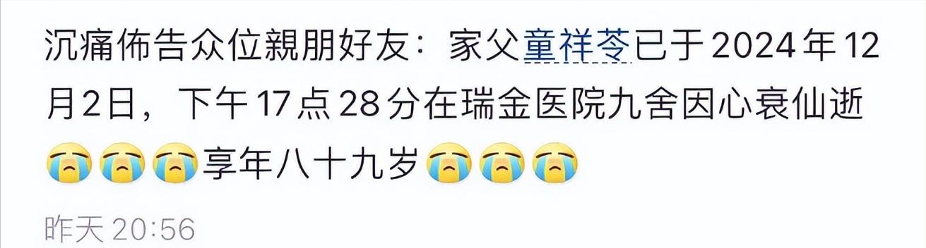 童祥苓去世后,其儿子更新了账号,他悲痛悼念父亲,告知父亲于2024年12月2日下午17点28分在瑞金医院走完了89年的人生之路,去了天国,爸爸,您一路走好,再没有病痛,没有忧扰,和先祖团聚,爸爸,儿子想你,您放心我会用生命守护好妈妈,让她安享天年。