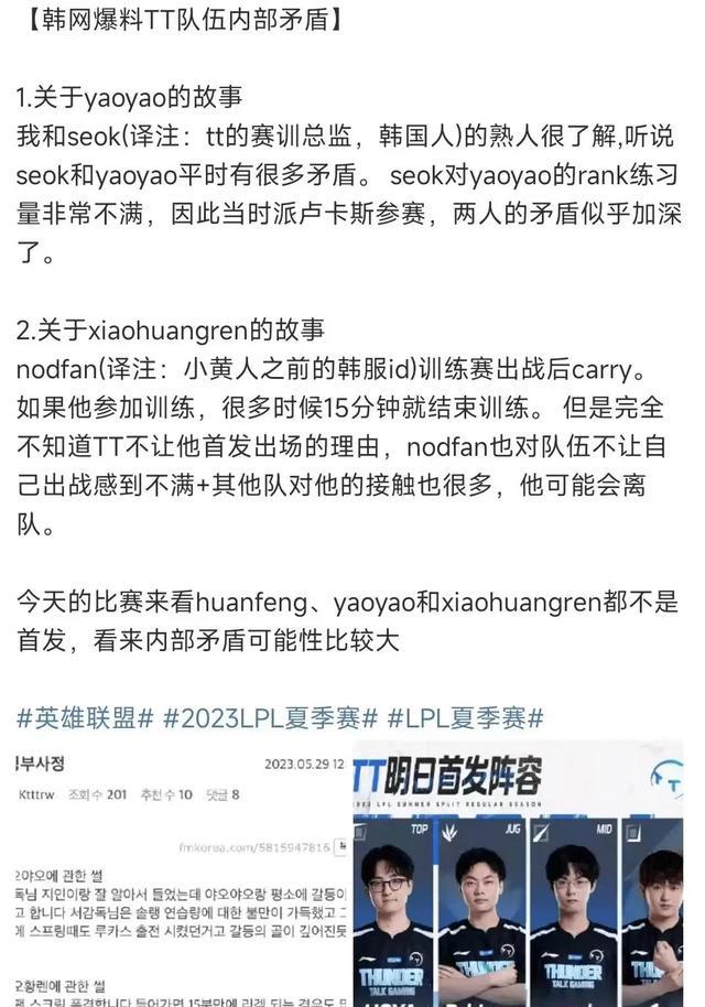 与此同时韩网那边也给出爆料,爆料称TT战队队内打野小黄人的训练赛发挥非常好,但是就是不给上场,LPL观众对这个爆料表示怀疑,因为韩网给出LPL的爆料还是非常罕见的,当然不排除一种可能,就是和TT韩援相关,可能有和Ucal或Hoya比较熟的人在韩网那边给出爆料。