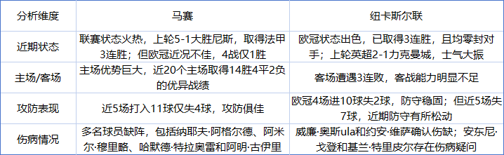 · 战术风格对决:这将是一场风格鲜明的对抗。马赛主帅德泽尔比与纽卡主帅埃迪·豪彼此熟悉,过往交锋场面开放,进球不少。马赛预计会利用主场优势主动出击,而纽卡则可能依靠稳健的防守和高效的反击与周旋。