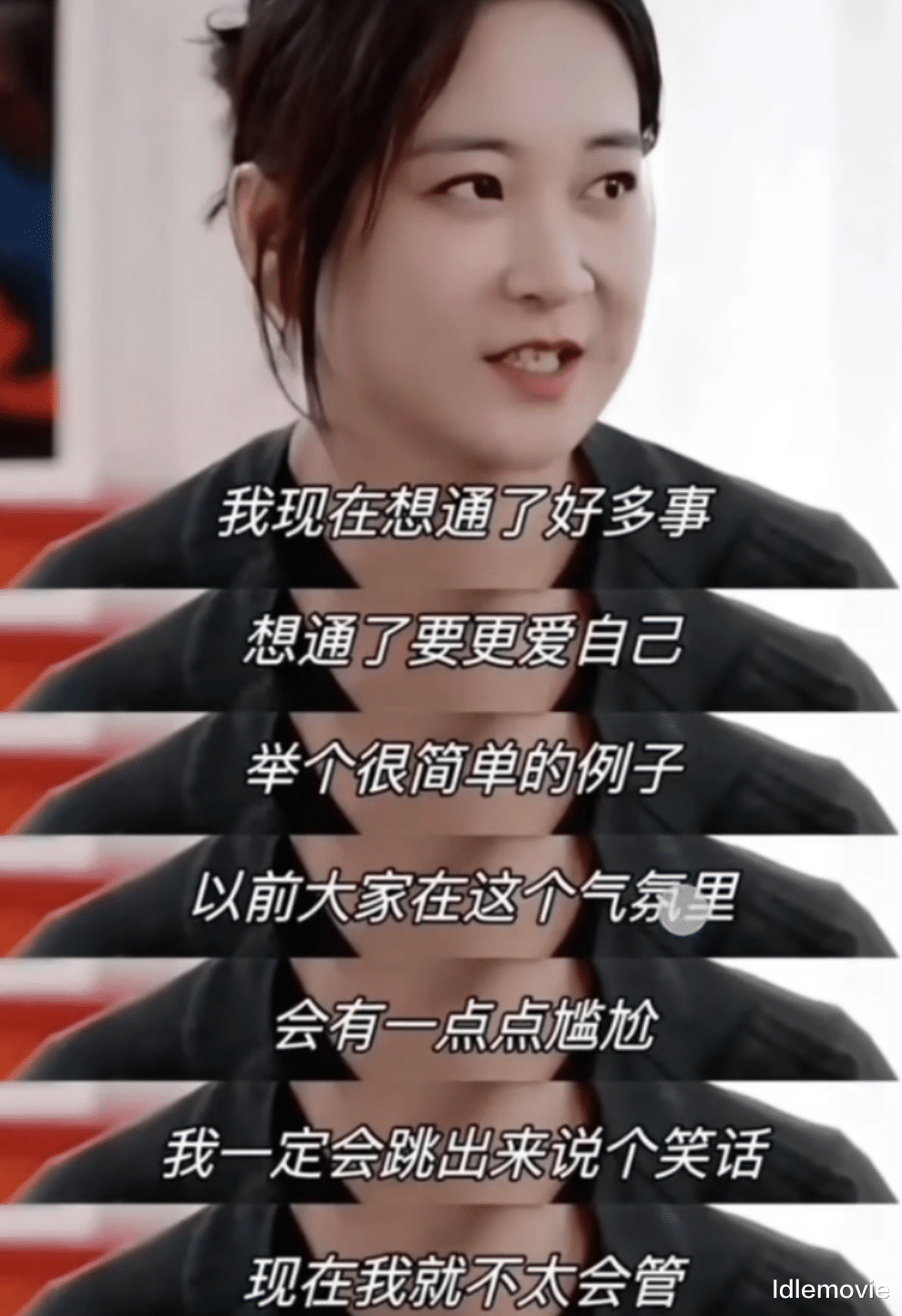 原话是:“我现在想通了好多事,想通了要更爱自己,举个很简单的例子,以前大家在这个气氛里会有一点点尴尬,我一定会跳出来说个笑话,现在我就不太会管。”