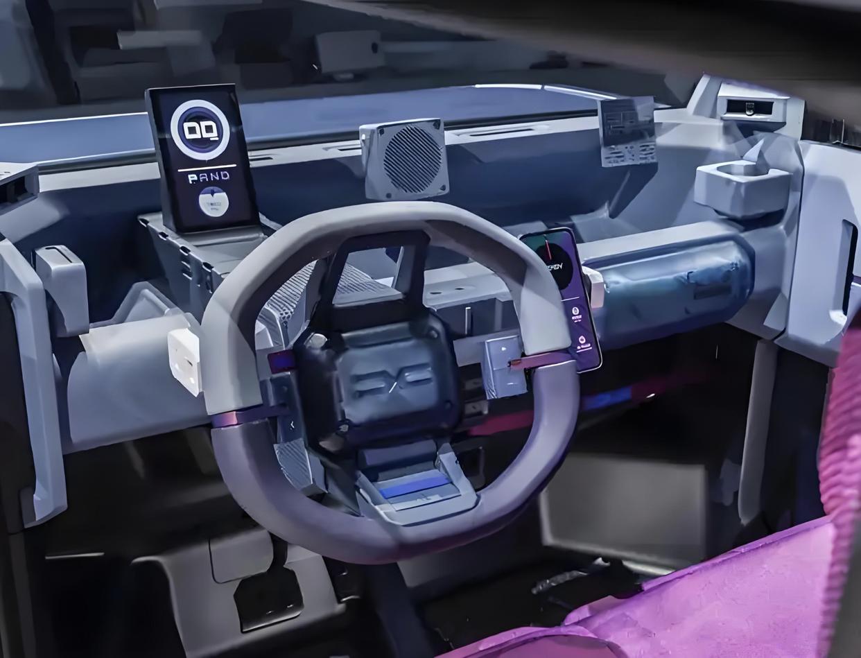 达契亚Hipster车内采用了更加简约的设计理念,车顶棚和环抱式中控台采用了更加环保的米白色软性材质,门板四周和地毯则采用了黑色软性材质的铺陈,还加入了黑色碳纤维装饰面板、银色金属材质的点缀,再配上四个独立的枣红色沙发座椅和蓝色的安全带,让整车内饰的氛围更加活跃。前座为连通主驾与副驾位置的网眼靠背长凳,车身内部包括 11 个选装位点,提供手机支架。中控台配备了具有未来感的全息方向盘设计,还加入了无级变速模式,省去了变速箱的结构。科技感方面,该车配备了两个类似手机的多媒体彩色大屏,还有HUD全景全息影像,科技感超前。