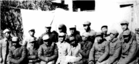 1940年,鲁西东平县张博士集一一五师教导第三旅政工会议后合影。前排左一范阳春(组织部部长)、左二邱如发(八团政治处主任)、左三刘汉(九团政委)、左四钟学林(七团政治处主任)、左五石新安(一分区政委)、左六肖华(鲁西军区司令员兼政委)、左七王辉球(军区政治部副主任)、左八郭华(九团政治处主任)、左九李仕才(八团政委),后排右二曾思玉(军区政治部主任)、右三姜思毅(宣传部部长)、右七杨俊生(七团政委)