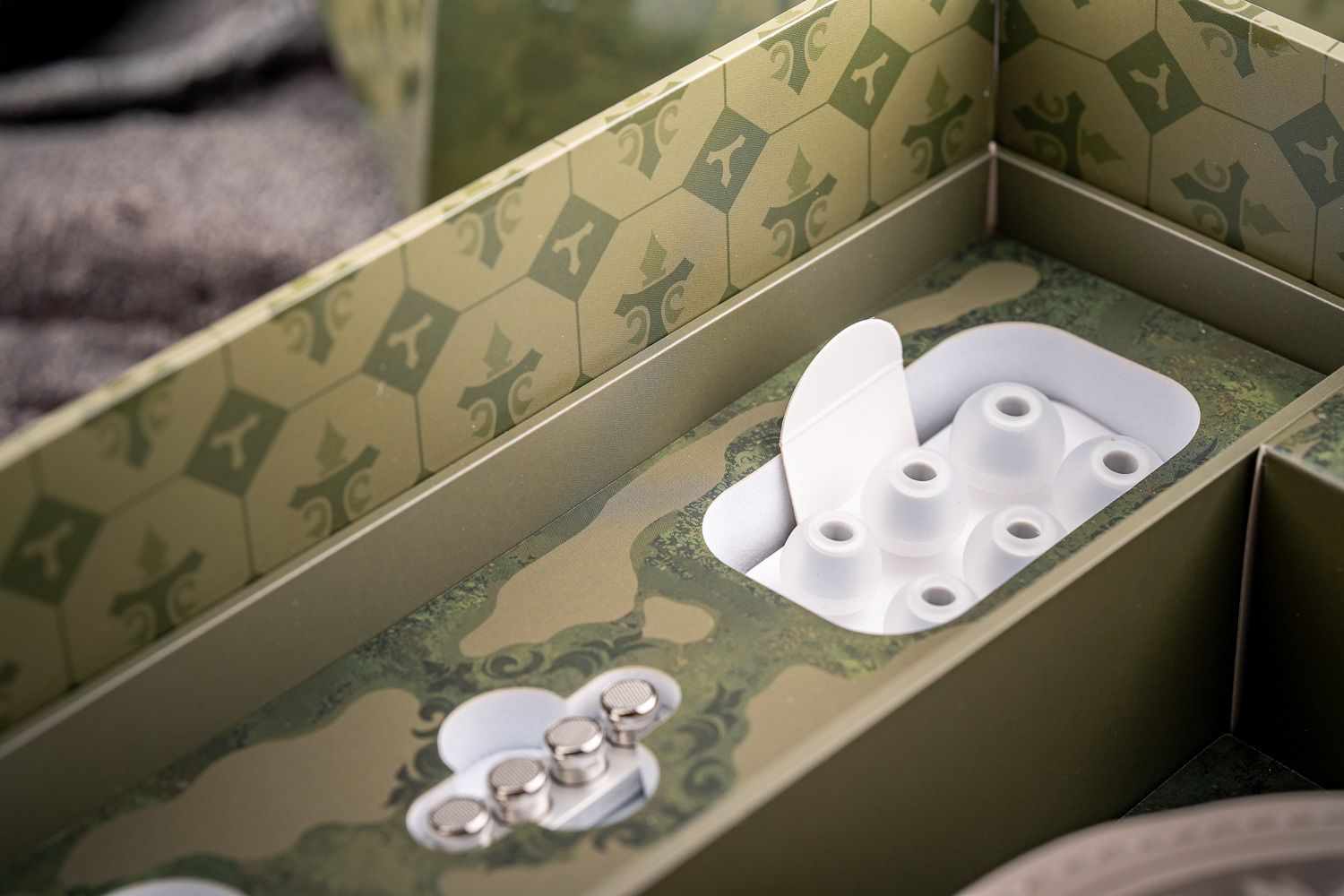 除了包装内附赠的标准配件外,TANCHJIM还给购买失落庄园的用户赠送了一个立牌、明信片、徽章,其中这个立牌设计的非常精巧,每一个插口都算是防呆设计、一个萝卜一个坑的那种,你只要看到插片的尺寸能够对应哪个插槽就可以轻松快速地完成装配,我相信会成为很多玩家们的标配桌搭。失落庄园的开箱过程,可以说是我开箱无数耳机到现在,情绪价值拉的最满、包装配件最有诚意、从外在用料和内在的设计方面都双双拉满的一个,乃至已经不像一个单纯的HIFI耳机、而是颇有在开箱文创产品的感觉。