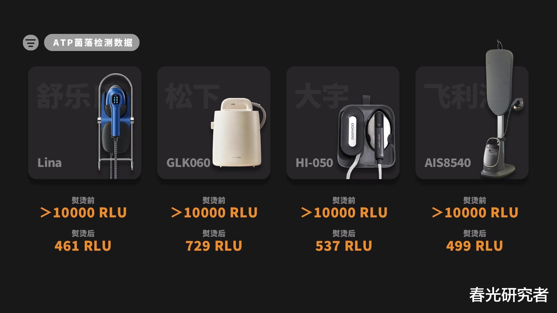 然后我们也用ATP检测仪做了测试,在熨烫前的衣服和4款挂烫机熨烫后的衣服上进行取样,结果非常接近,菌落总数都有大幅度的降低,也就代表这4款产品都有不错的除菌效果。