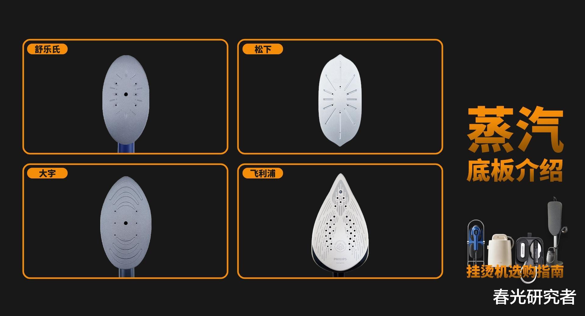 首先来看蒸汽性能,因为蒸汽是从底板喷出来,所以这里就先来看一下它们的蒸汽孔,舒乐氏和大宇都是7个喷气孔,松下是6个,而且排布非常居中,覆盖面稍微小一些,最后是飞利浦,整整34个喷气孔,覆盖面和底板面积都是最大的。
