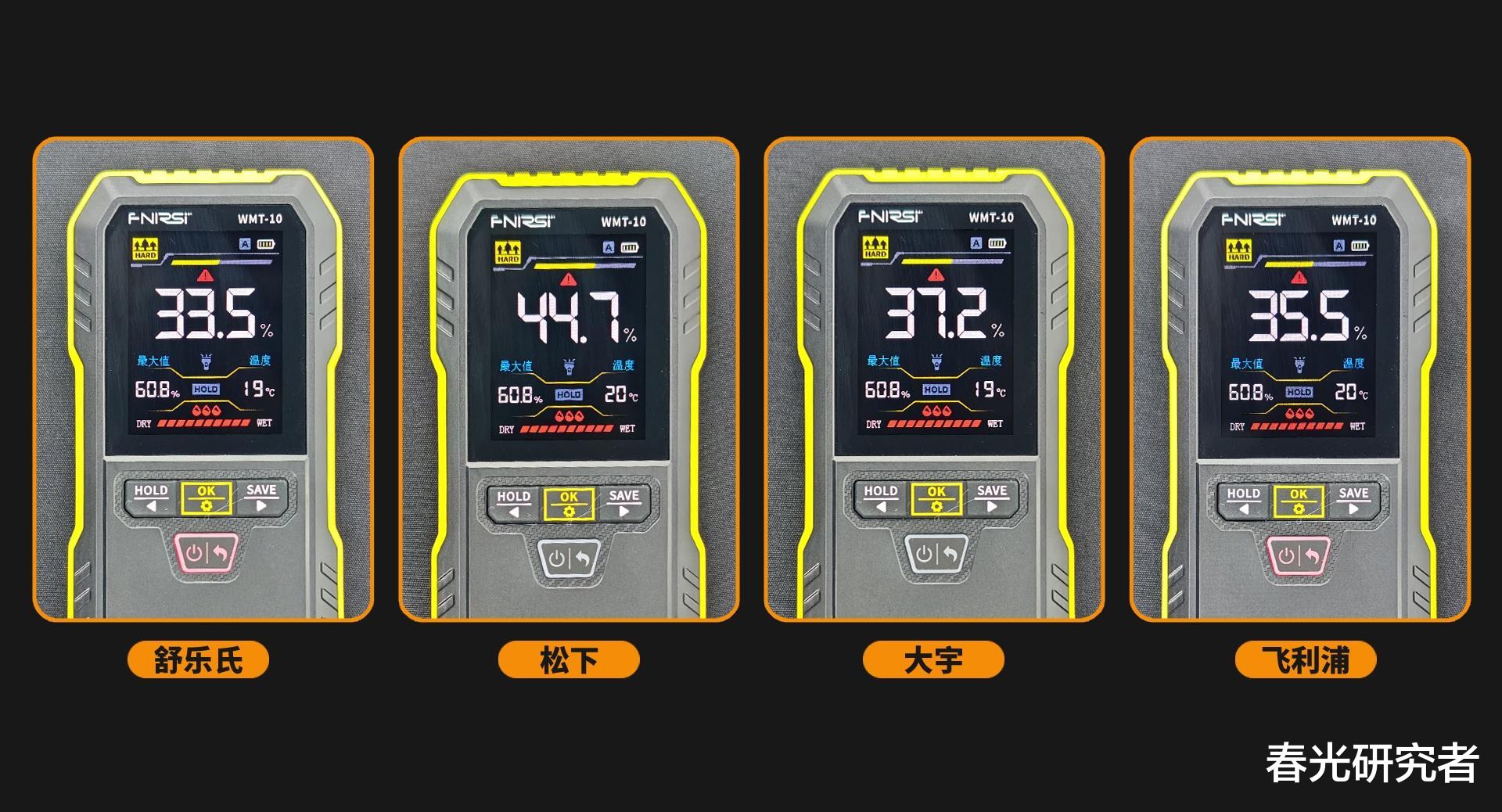 但是我们在过程中还是发现了一点点不一样,就是松下的这款有喷水问题,所以结束后我们又用湿度检测仪做了测试,的确,虽然平整度差不多,但是松下的湿度要高出10%左右,也就代表的确是有喷水。至于其他几款,基本是30%多的湿度,完全可以直接上身穿。