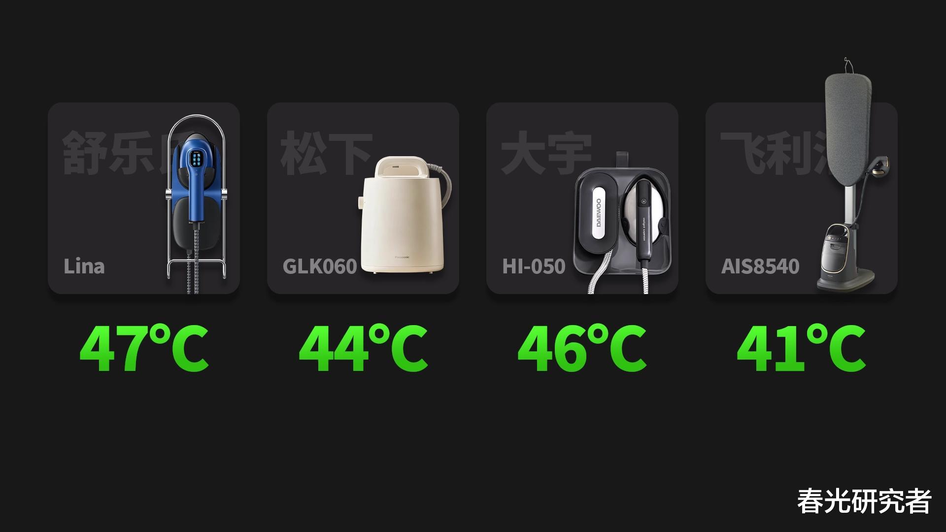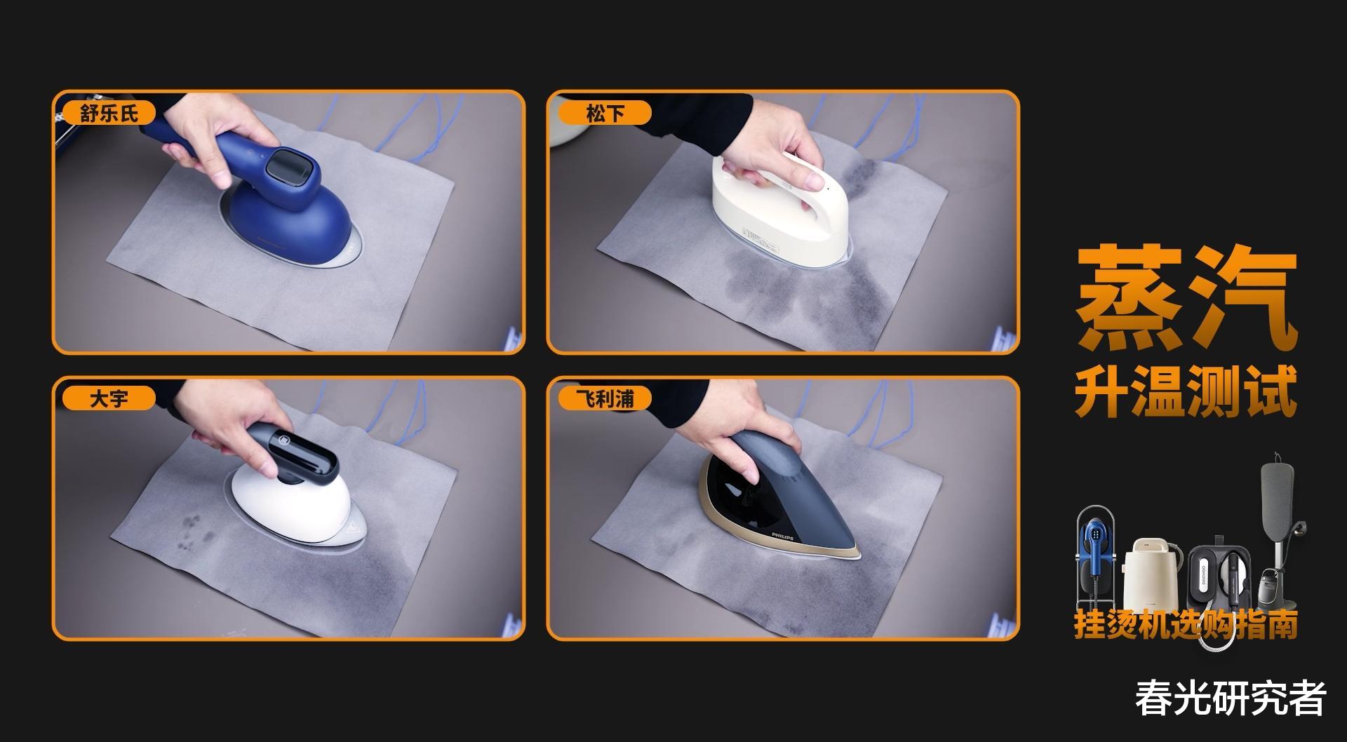 总结一下这次的蒸汽测试,舒乐氏、松下、大宇这3款整体都还不错,舒乐氏的升温最快,后期温度也比较平稳;松下最大的问题就是刚说的,会有漏水现象;大宇整体升温也是很快,只是后期略微有一点温度过高。至于飞利浦,它的蒸汽量是大,但是是向四周去扩散的,穿透性一般。