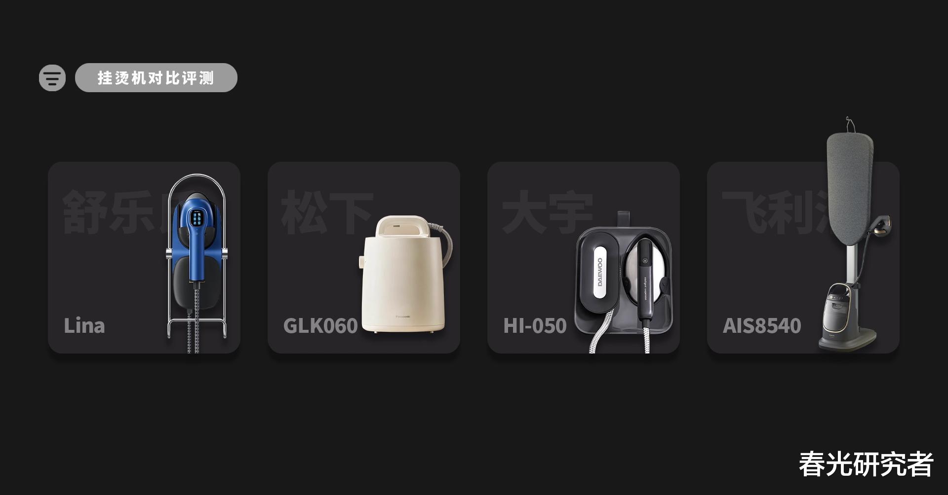 但如果只用舒乐氏Lina这一款产品来展示,大家也很难评判好坏,所以我们又找来了比较热销的三款挂烫机来作为参照组,分别是松下、大宇、飞利浦。
