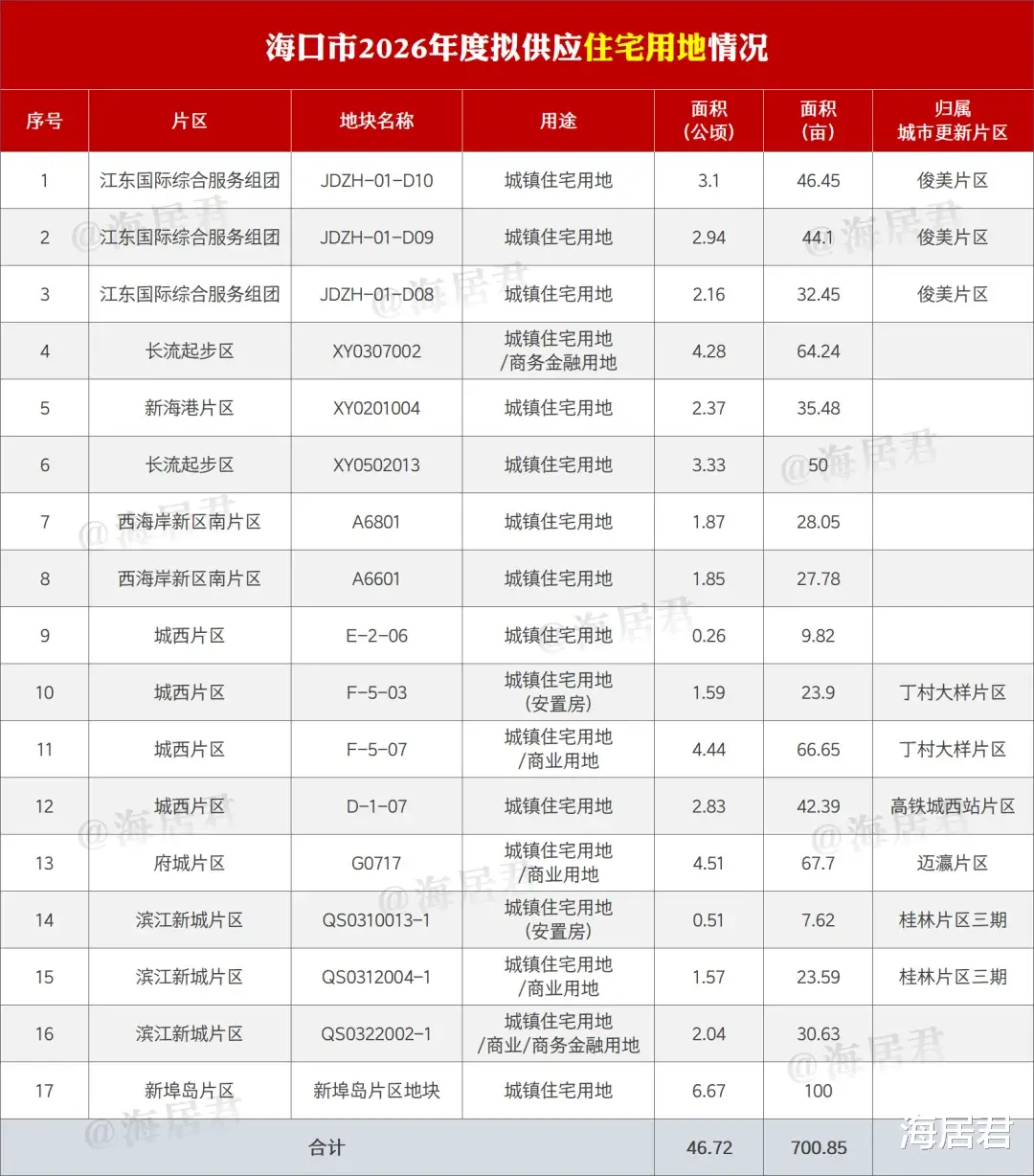 2026年海口计划供应700.8亩住宅用地,其中市场化商品住房用地669.3亩、安置房用地31.5亩。
