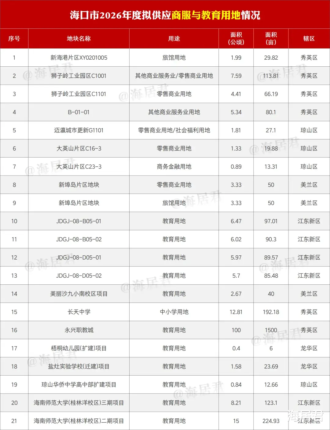 2026年海口计划供应教育用地12宗、约2484.92亩,其中7宗为高等教育用地、5宗为幼儿园与中小学用地。