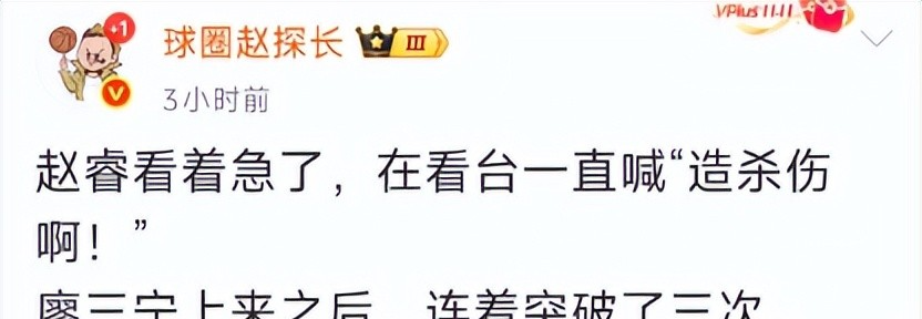 在现场看球的赵探长也第一时间发表了动态,他表示:当赵睿看过开局比赛后非常着急,在看台上一直喊“冲击内线”!本场比赛只有廖三宁突破打的很犀利,胡明轩完全迷失自我,最擅长突破的赵睿心有余而力不足啊!